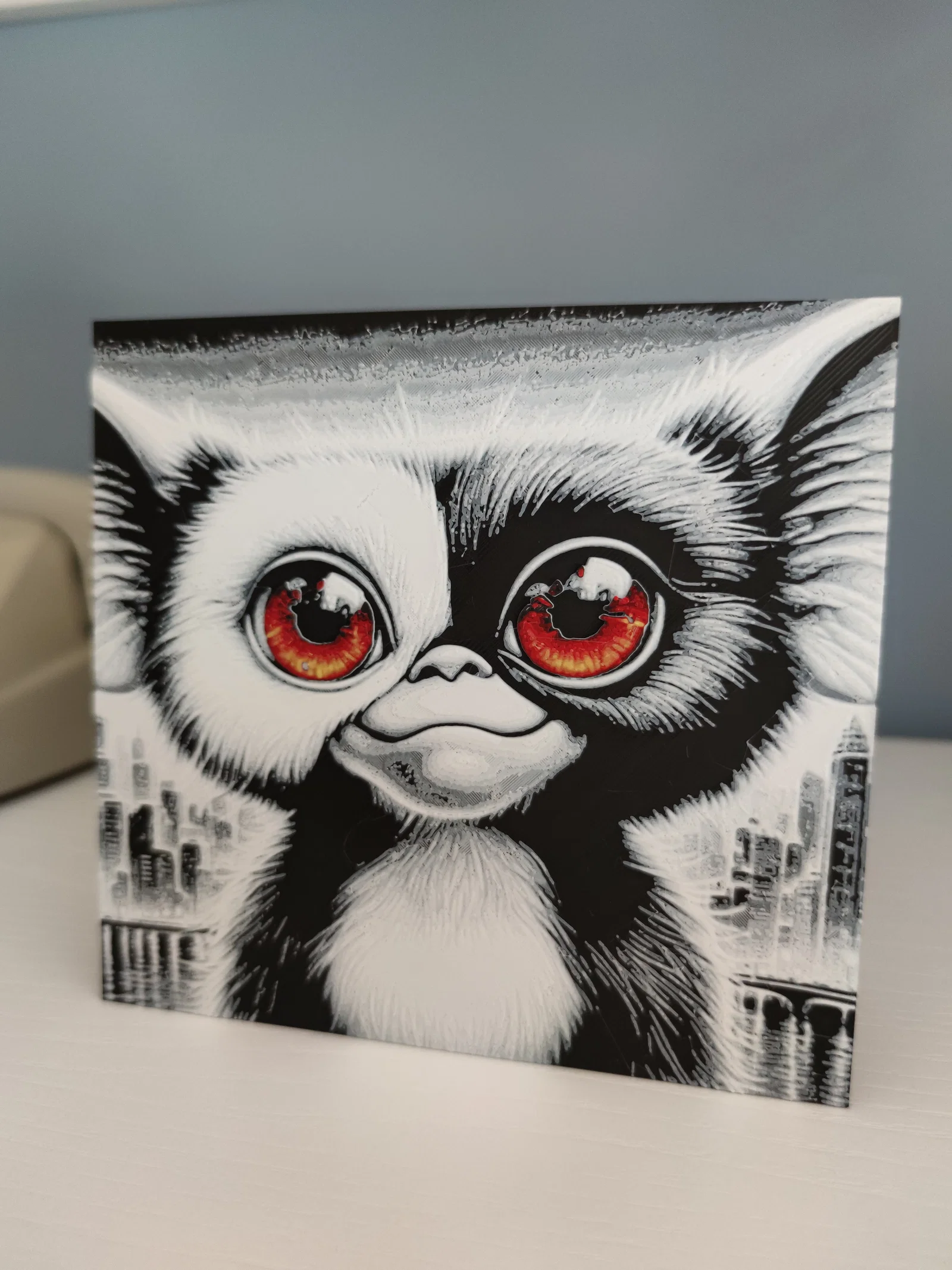 Mẫu Hueforge Gremlins với hướng dẫn in Hueforge rõ ràng: 100% infill, layer height 0.08mm (base 0.16mm) và các mốc đổi màu filament theo từng layer: Black, Jade White, Black, rojo rồi Yellow đến hết.
