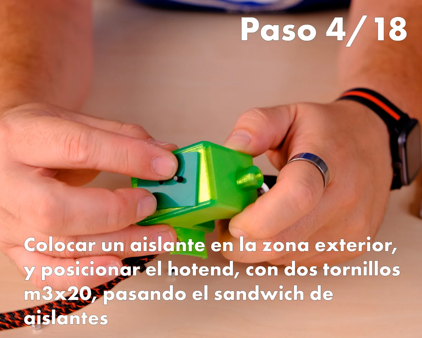 4- Đặt 1 miếng cách nhiệt ở phía ngoài, rồi canh vị trí hotend; dùng 2 vít M3x20 xuyên qua “sandwich” các lớp cách nhiệt
