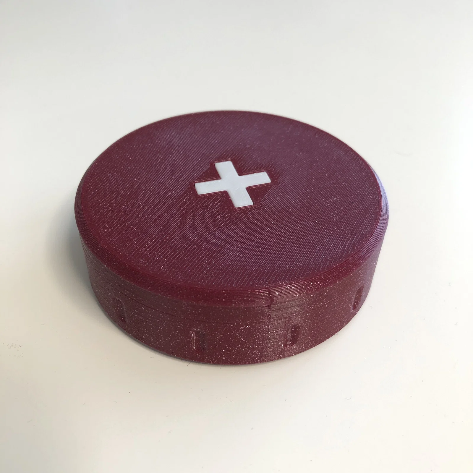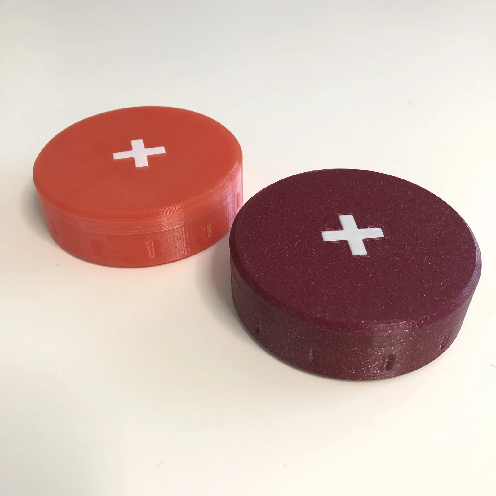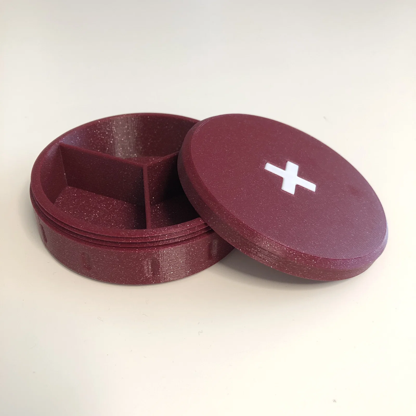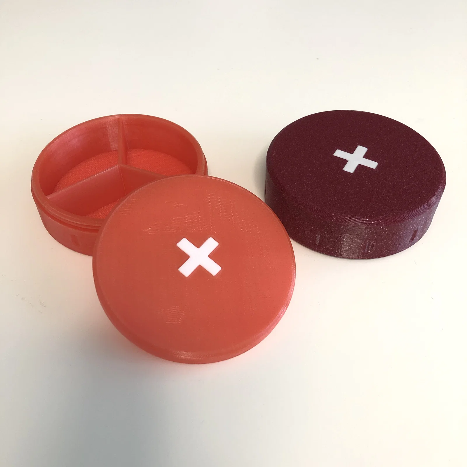 Hộp đựng thuốc đi du lịch dạng tròn, đường kính 80mm, cao 25mm. Có tùy chọn thân 3 ngăn hoặc 4 ngăn. Phần chữ thập in riêng rồi dán lên nắp; khuyên dùng layer height 0.15mm để ren đẹp.