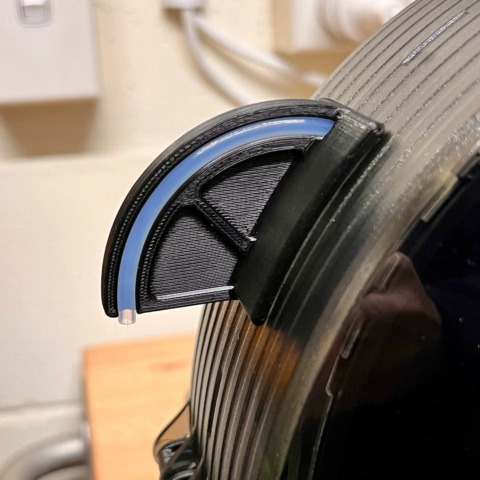 Ống có thể đi ra theo hướng gần thẳng đứng hoặc gần ngang. Nếu đi gần ngang, và cuộn filament được gắn phía trên máy in, bạn có thể in thêm phần guide rồi gắn vào bên ngoài Sunlu S2 như hình minh hoạ. Nếu không có guide, ống PTFE có thể bị gập (kink).