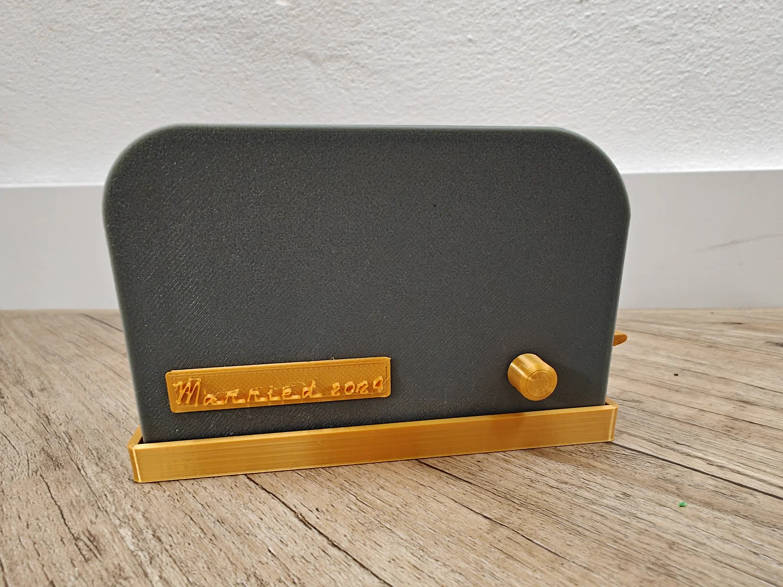 Bản Toaster quà cưới được cải tiến: khay lớn hơn, cơ cấu cần gạt chắc hơn, kéo dài thanh gắn núm xoay và tích hợp tấm giữ tiền vào cơ cấu. Khuyên in phần cơ cấu bằng PETG, dùng supports (10% infill).