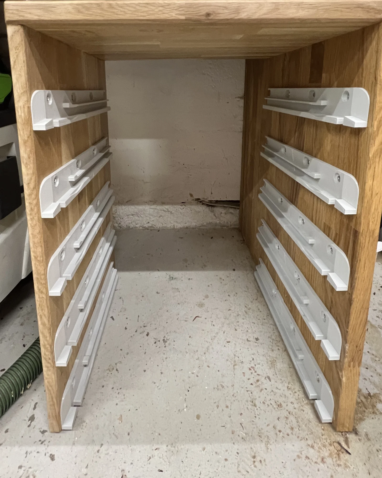 Giúp khóa/cố định Systainer tại chỗ trong xe, kể cả lúc đang lái. Mình đặt khoảng cách giữa 2 ray là 42 mm, và chừa 20 mm giữa phần trên và dưới của các Systainer để lấy khoảng hở (clearance).