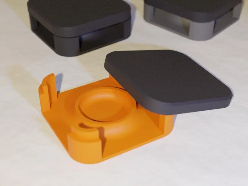 Về cơ bản nó chỉ là một cái hộp nhỏ (40x40mm, vừa đủ lớn để không vô tình bị hút vô máy hút bụi), in rất nhanh và dễ (nhớ là sẽ cần vài cái — tới giờ mình đã in hơn 20 cái) và mở bốn phía (để kiến và gián ngửi được mồi và dễ chui vào). Mục đích là tránh để bột mồi hoặc keo dính làm bẩn nhà, và giảm nguy cơ bị nuốt nhầm (ví dụ thú cưng).