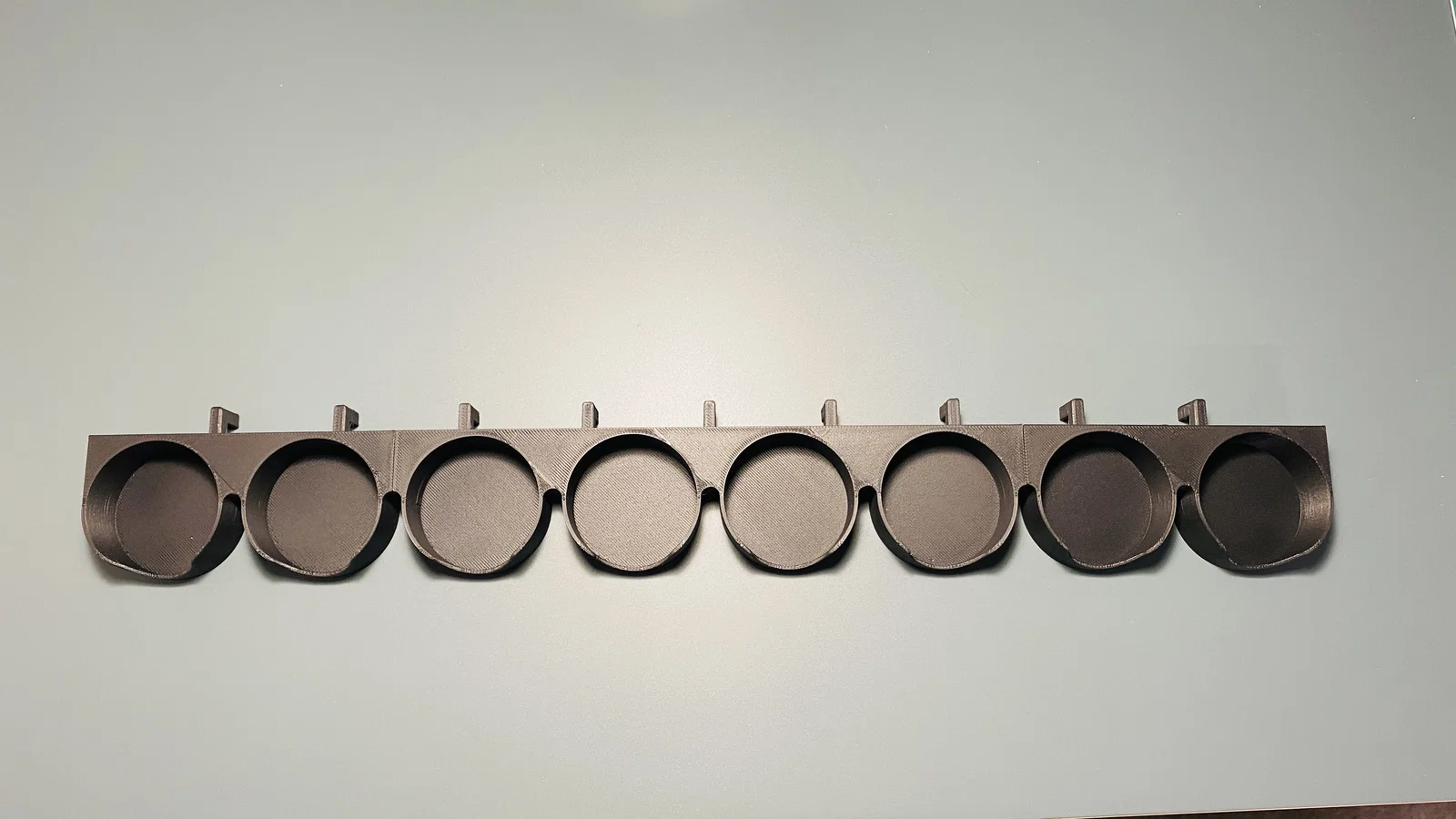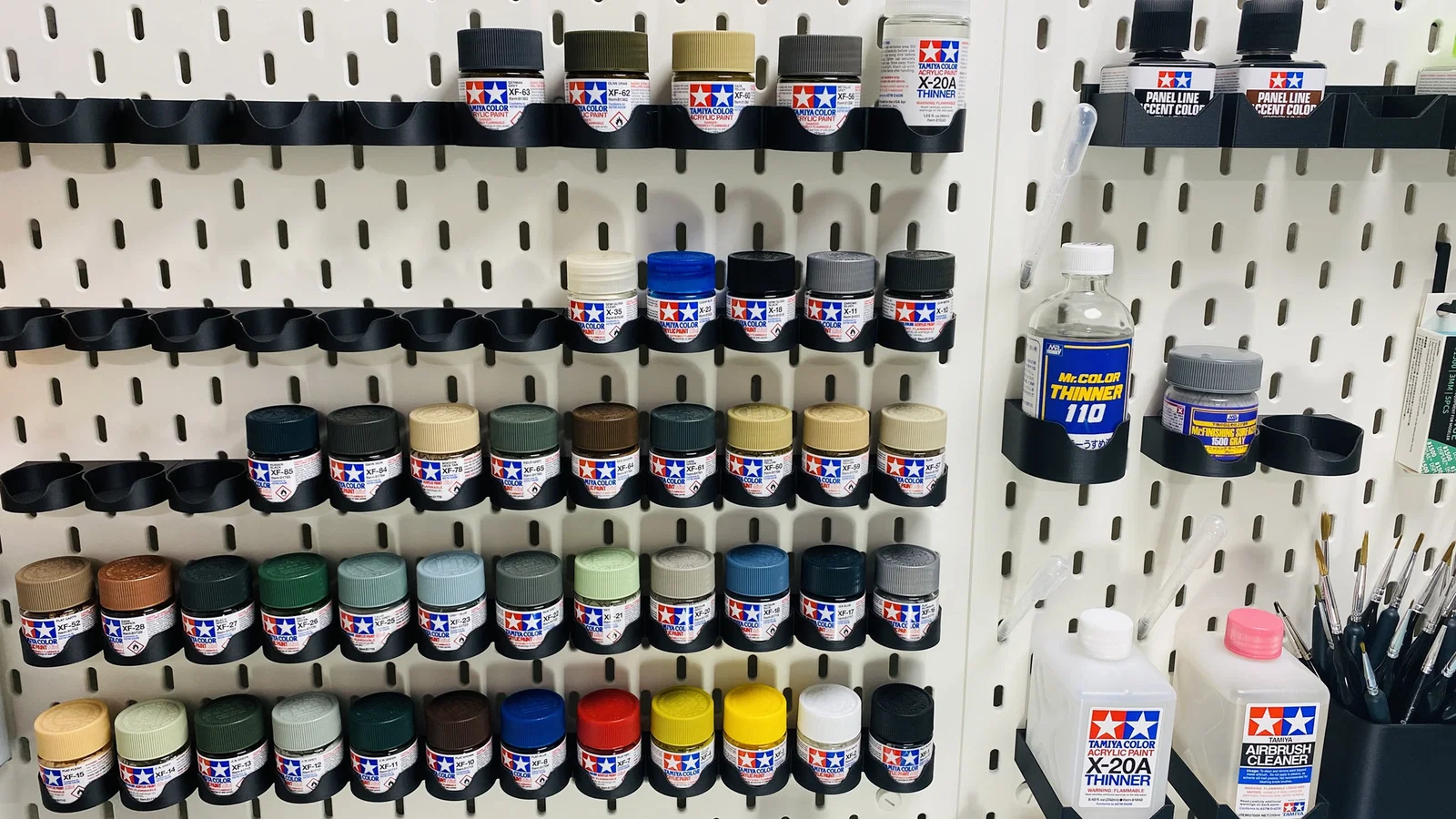Hệ kệ sơn Tamiya dạng modular dành cho bảng IKEA SKÅDIS, dùng cho chai sơn 23ml và có thêm bản cho sơn mini 10ml. Gồm module trung tâm, có thể nối dài theo ý và chốt bằng module trái/phải.