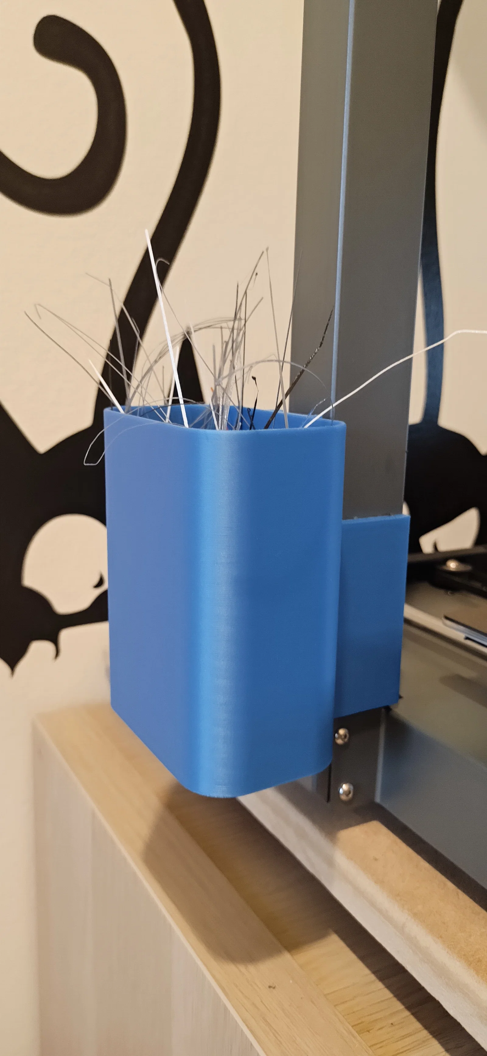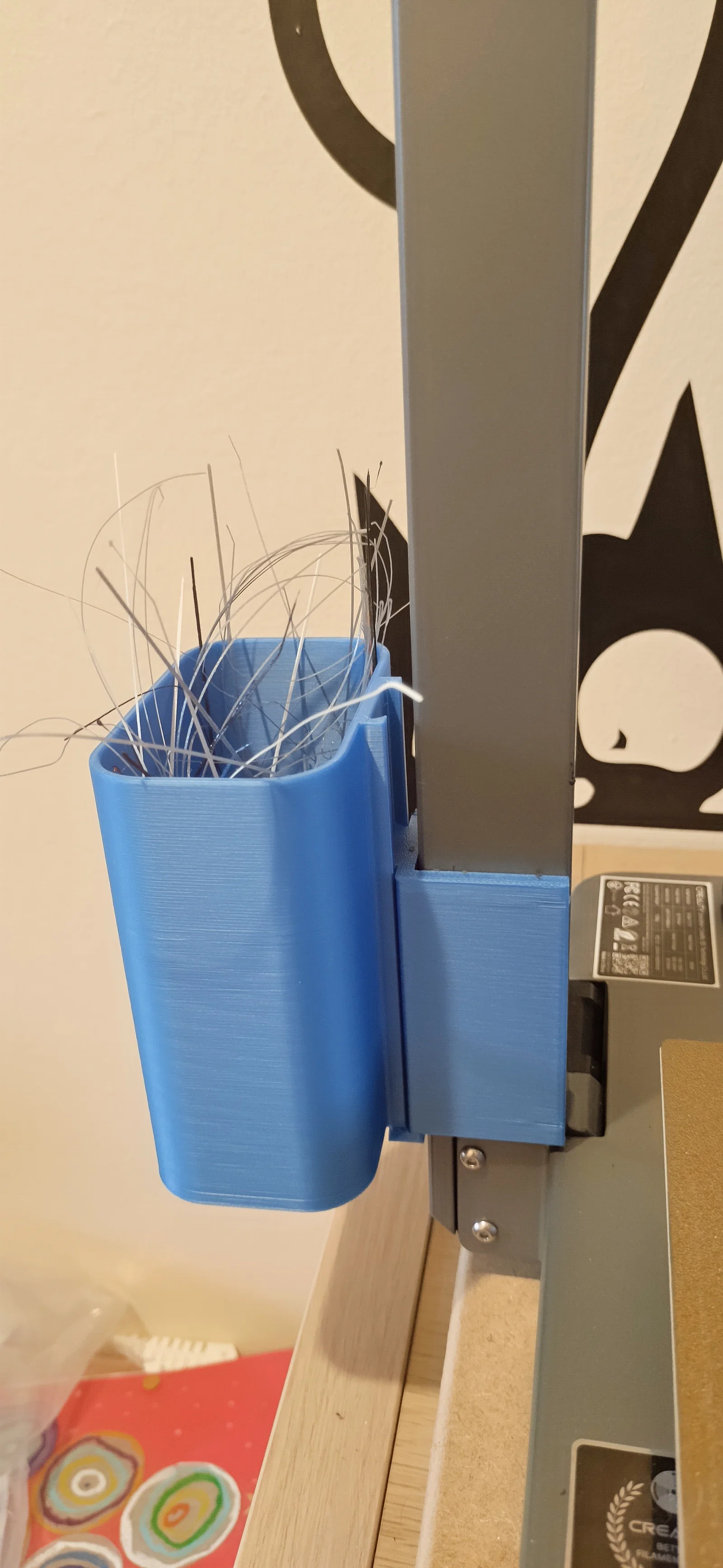 Đây là cái thùng rác mình thiết kế cho Ender 3 V3 core XZ. In bằng PLA, layer height 0.25mm, nozzle 0.4mm. Mình dùng 2 vít gỗ (2.5x11mm) để bắt vào thanh phía sau và dùng thêm băng keo thảm (carpet tape) để dán ở mặt trước của chassis. Phần thùng có cơ chế trượt vào đế, nên bạn kéo ra đổ rác rất dễ.