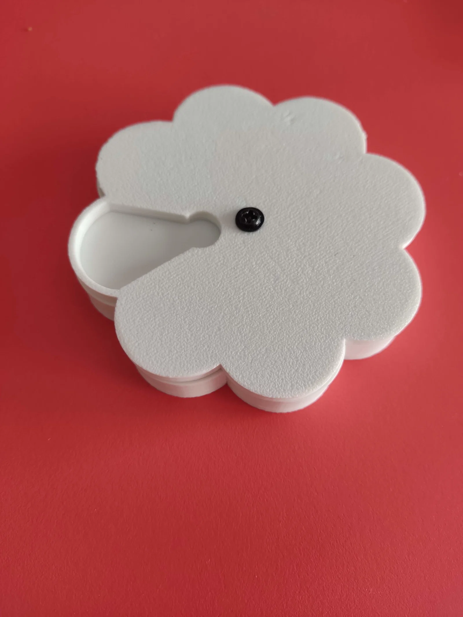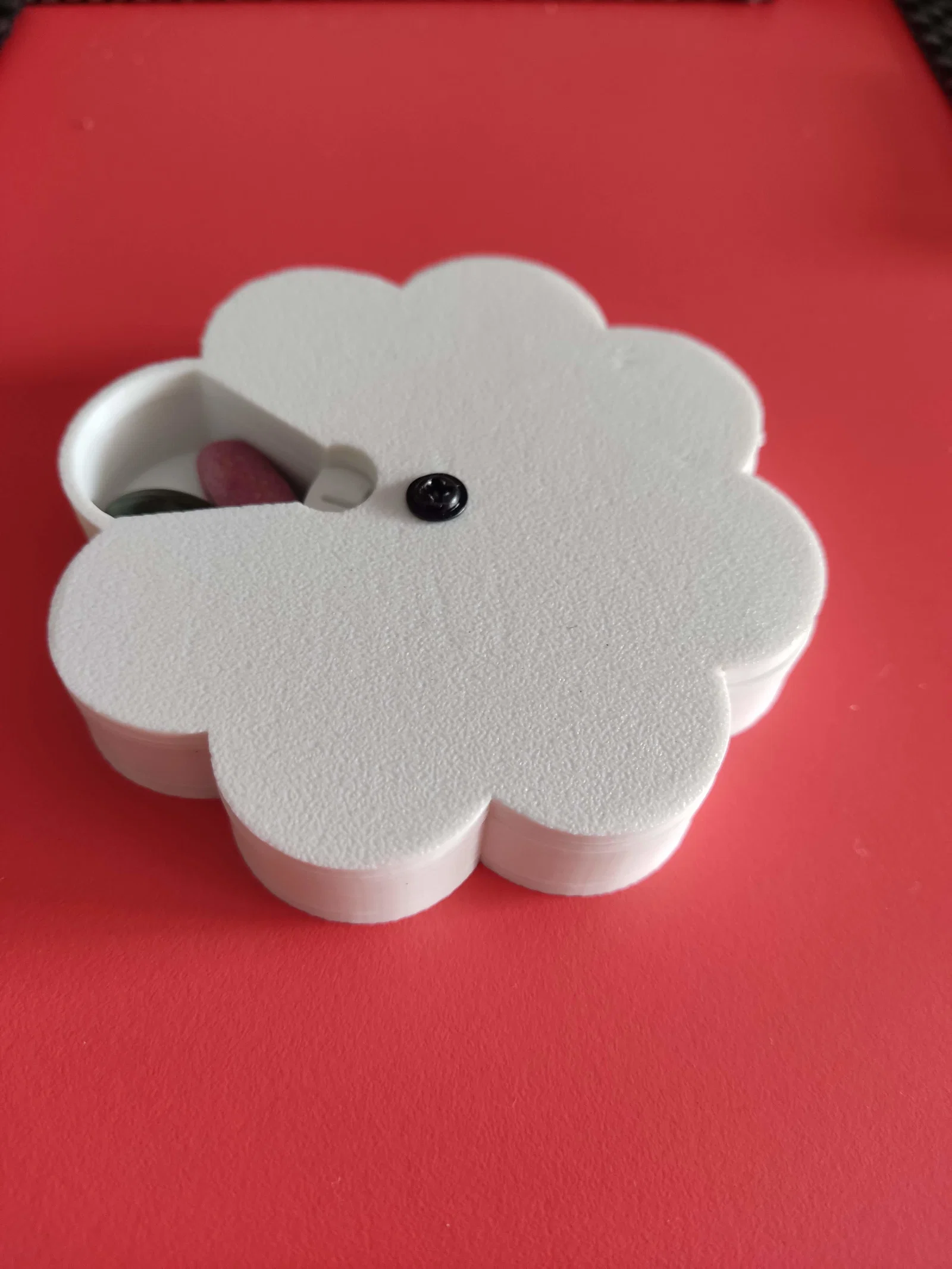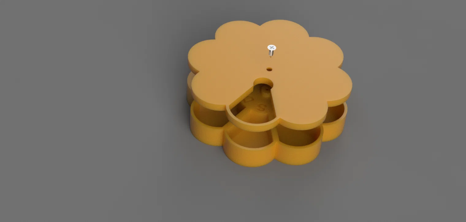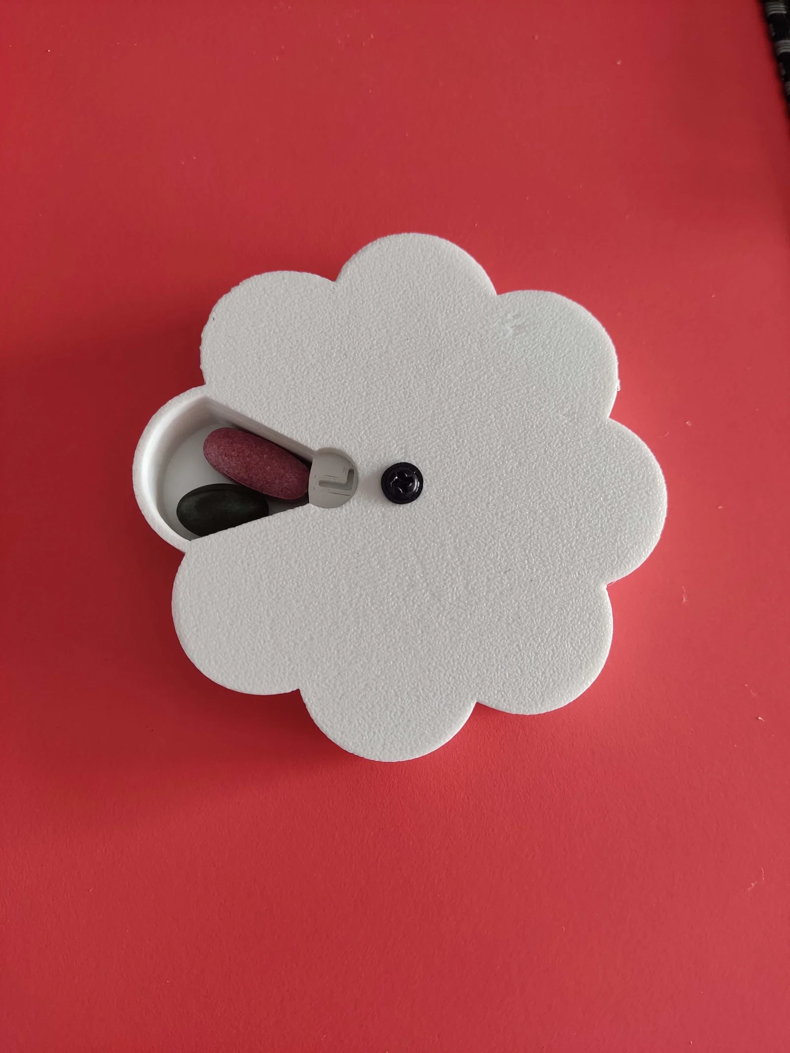 Hộp đựng thuốc theo tuần có chỉ định ngày; mỗi ngăn chứa thoải mái khoảng 3 viên. Nắp và thân được liên kết bằng vít tự ren kèm long đền M3x10mm màu đen; tác giả dự định làm bản không cần vít.