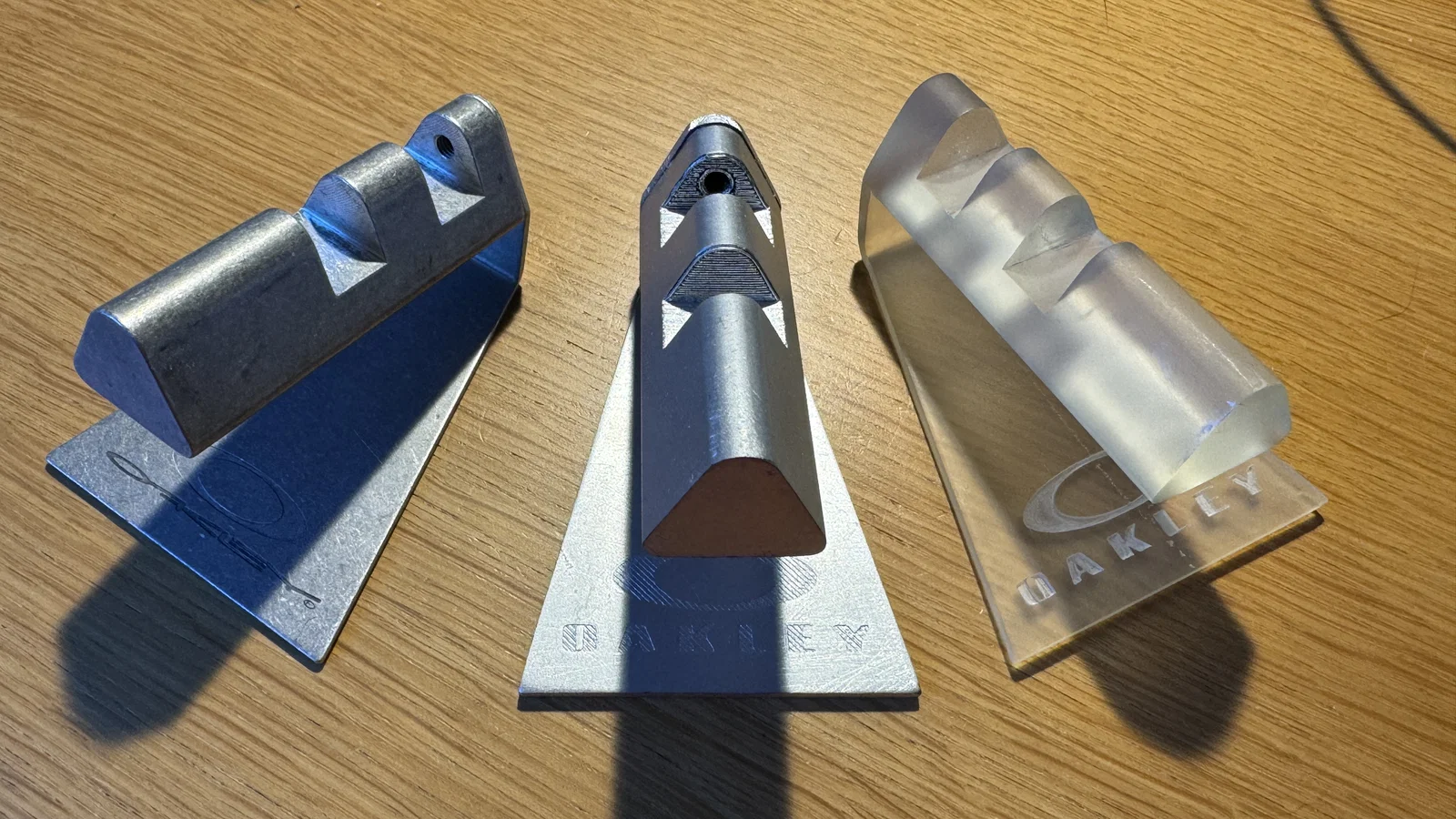 Mẫu này được làm dựa trên phiên bản kim loại thật của Oakley. Mình đã in thử cả FDM lẫn resin cho mẫu này và nhìn rất đẹp, đặc biệt là khi in resin trong (clear resin). Trong một tấm ảnh bạn sẽ thấy đủ cả 3 phiên bản. Bạn có thể dùng brass insert để liên kết phiên bản 2 mảnh lại với nhau.