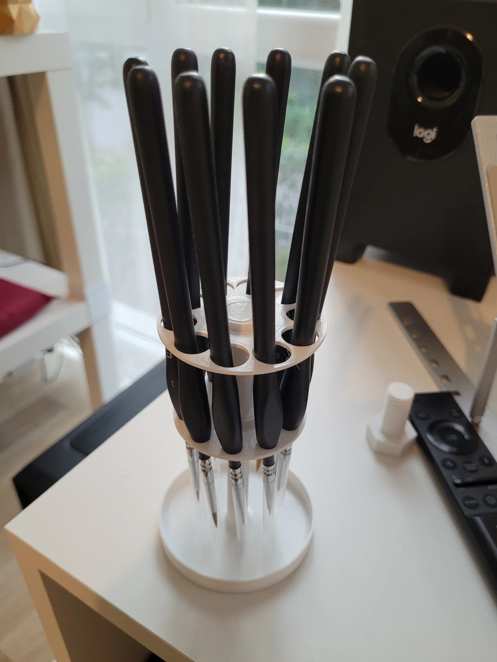 Mẫu giá đỡ dạng đứng cho 10 cây cọ, tiện để cất gọn hoặc phơi khô sau khi rửa. Thiết kế 3 phần: các plate in riêng rồi vặn ren vào đế. Khuyến nghị in ren layer 0.12 mm, đế 5 walls để chắc hơn.
