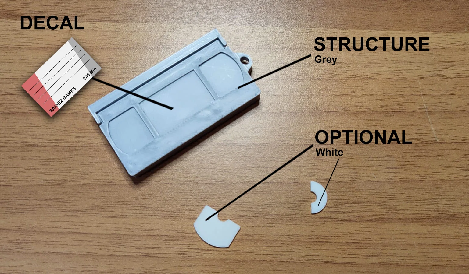 Móc khóa VHS phong cách thập niên 80: gồm phần STRUCTURE và OPTIONALS (tùy chọn) để trang trí cho đẹp hơn. Có kèm file PDF để in sticker dán lên. Nếu đạt 500 downloads, tác giả sẽ làm thêm decal.