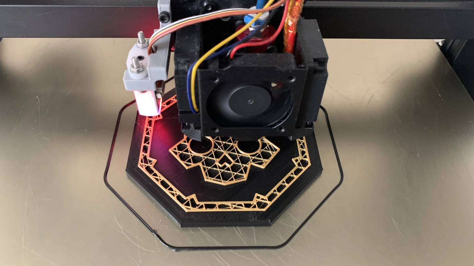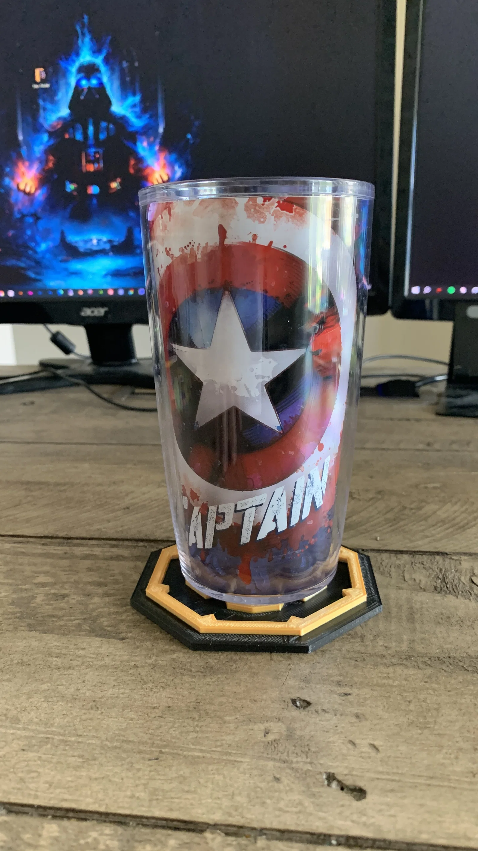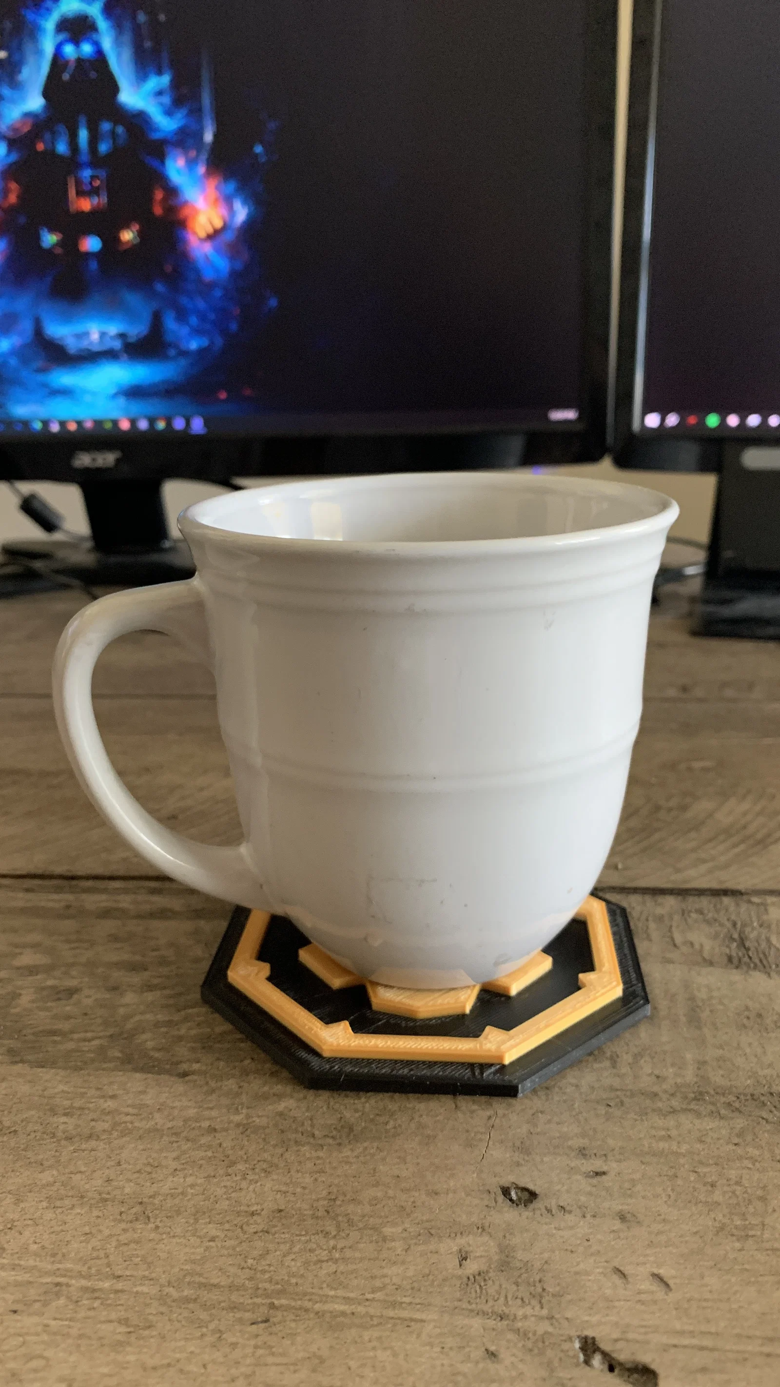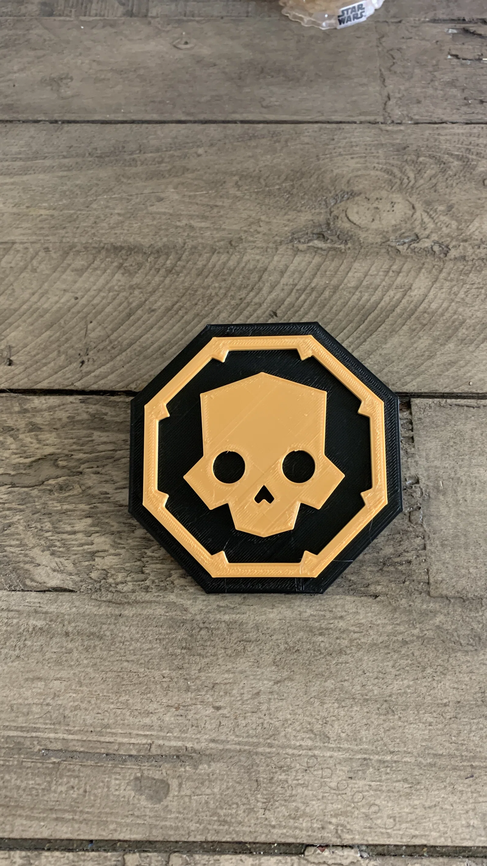 Mình có tạo bộ Helldivers 2 Coasters, gồm 2 biến thể hơi khác nhau. Bản được in trong hình là "coaster-2". Mình đã pause máy in và đổi màu lúc phần viền / đầu lâu (Skull) bắt đầu in để ra hiệu ứng hai màu.