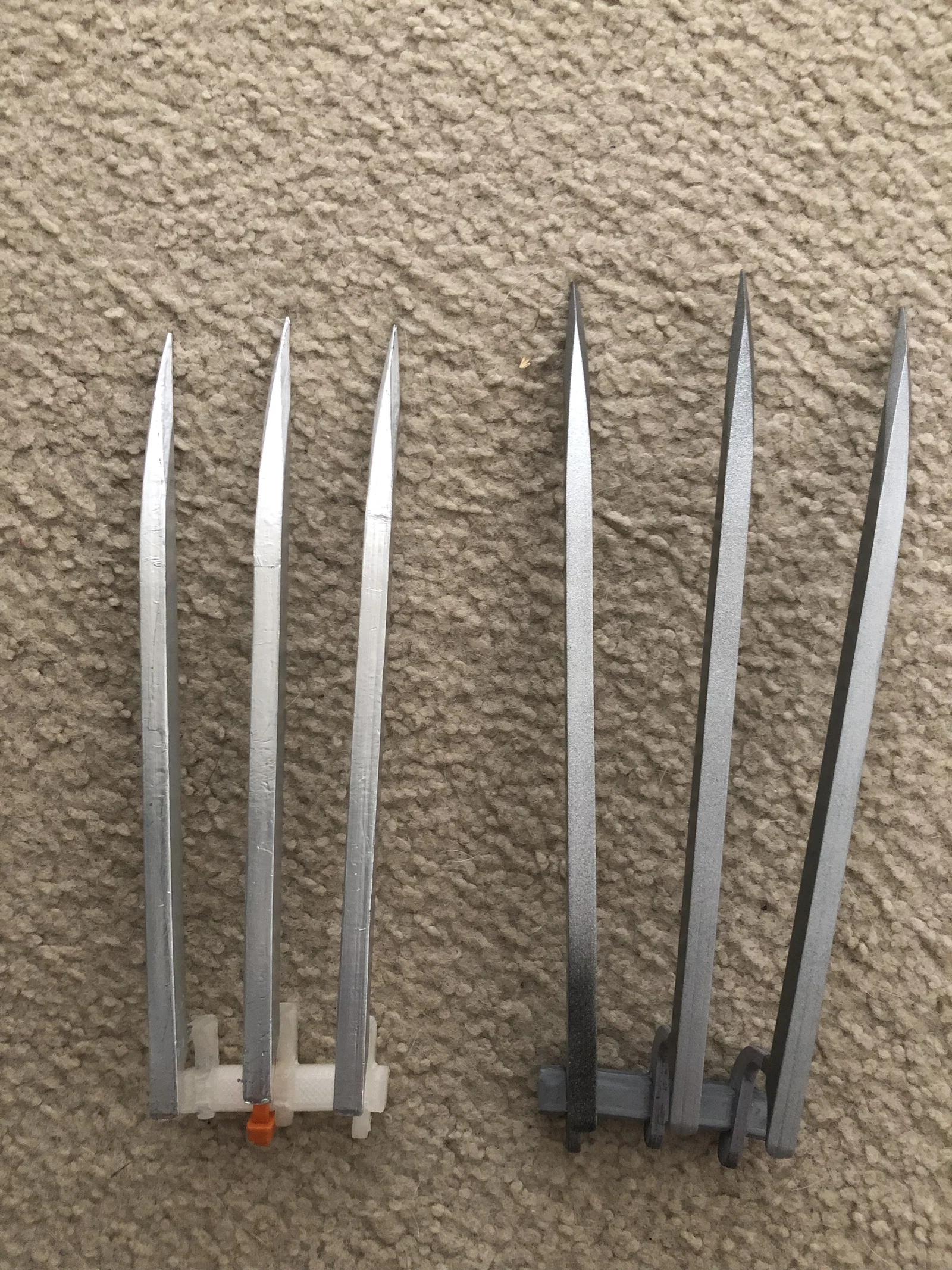 Tháng 7/2024: Đã thêm phiên bản móng giống trên màn ảnh hơn sau khi mình được xem trực tiếp đạo cụ quay phim X2 tại Marvel Exhibition. Bản này mỏng và hẹp hơn nên ít có khả năng cấn vào các khớp/ngón tay của người đeo. Đồng thời phần “tang” cũng dài hơn, giúp móng trông như mọc ra từ bàn tay ở vị trí lùi về phía sau hơn.
