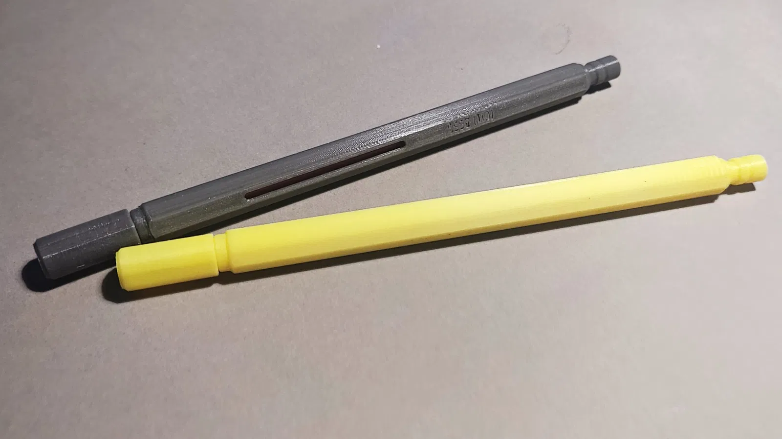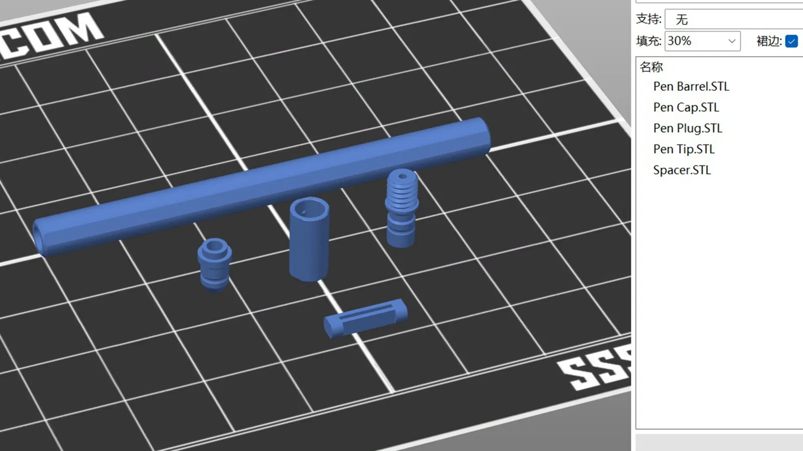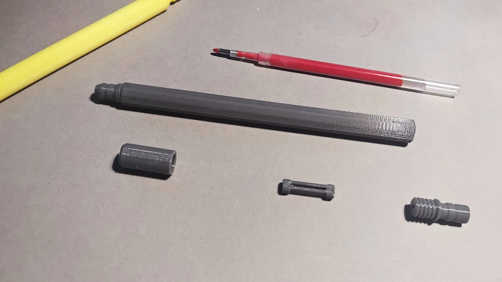 Nó có thể được in bằng cả vật liệu PETG và PLA. Chiều cao lớp được khuyến nghị là 0.1mm. Không cần hỗ trợ. Đầu bút cần được dán lại với nhau.