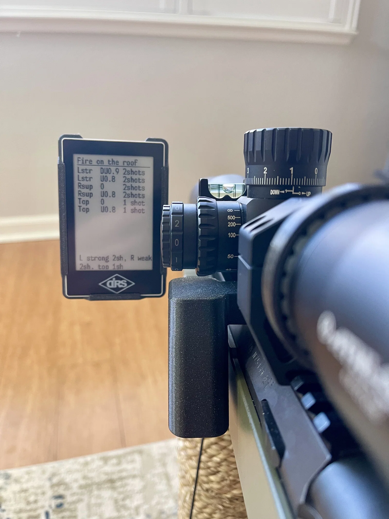 - Dùng đai ốc M4 và ốc M4 16mm còn lại để gắn thẻ E-Dope vào phần “tai” của giá kẹp.
