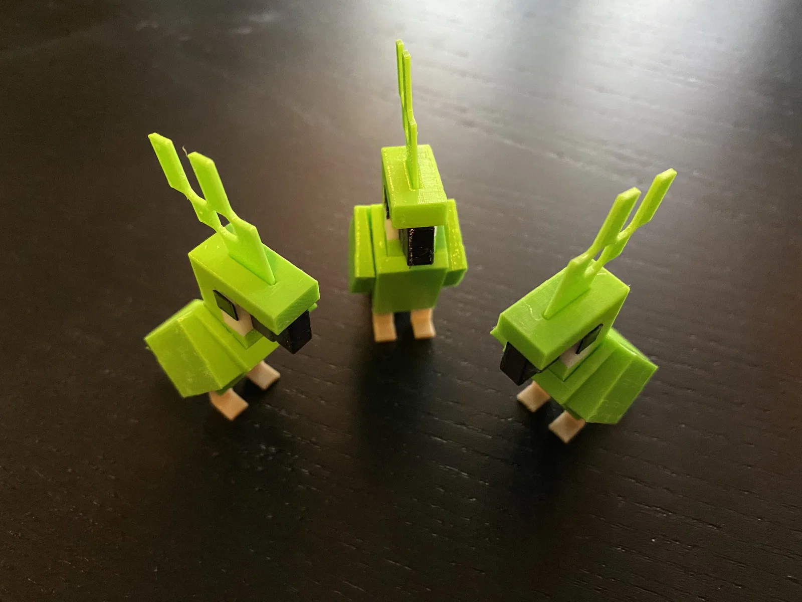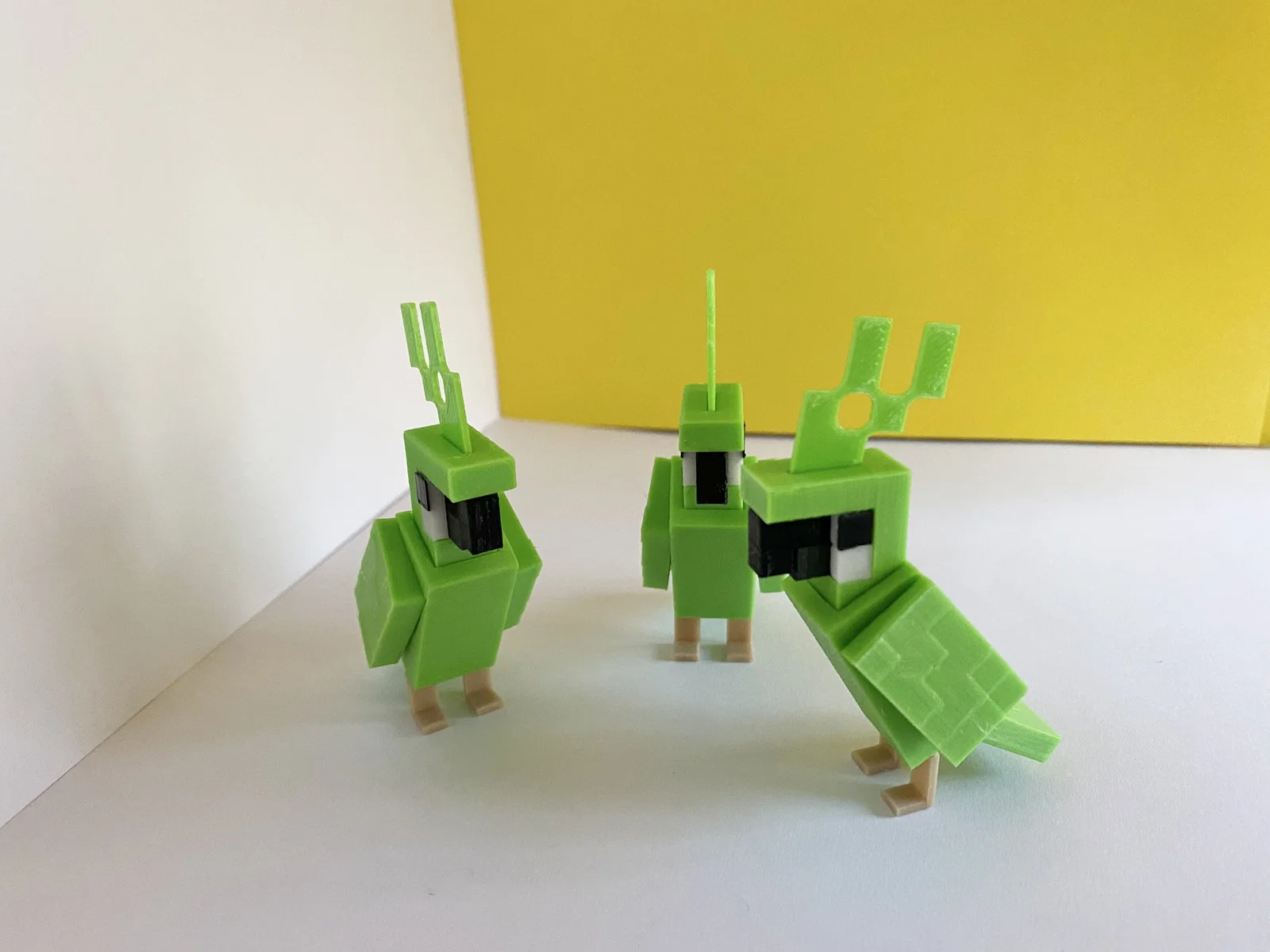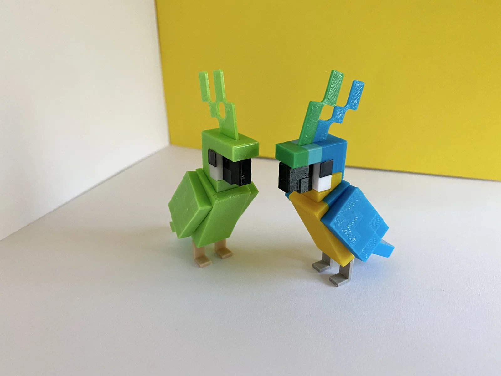 Mẫu vẹt xanh trong Minecraft. Cần 5 màu (Green, Black, Dark Grey, White, Light Brown), mỗi màu in riêng và thường không cần superglue. Có file 3mf minh hoạ cách in; lưu ý chân phải phẳng để dễ cân bằng.
