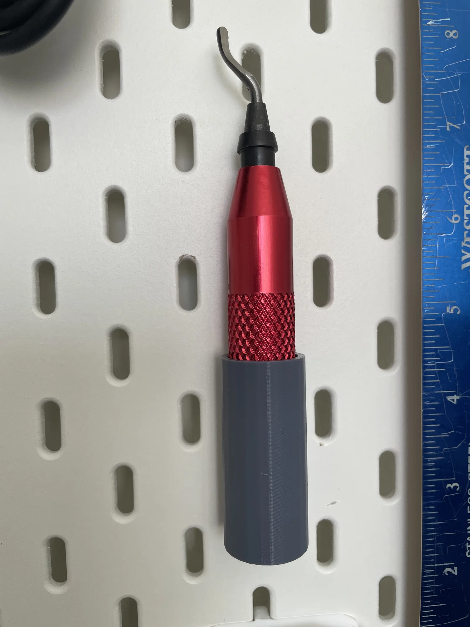 Sản phẩm này được thiết kế với đường kính lỗ cắm khoảng 19mm, tương thích cực tốt với hầu hết các loại tay cầm dụng cụ làm sạch bavia phổ biến trên thị trường hiện nay. Điểm cộng lớn là nó chỉ chiếm một vị trí cắm trên bảng Skadis, giúp tiết kiệm diện tích cho những món đồ khác. Khi anh em in 3D mẫu này, chỉ cần đảm bảo máy in đã được cân chỉnh tốt, vì phần kết nối với bảng Skadis cần độ chính xác cao để không bị lỏng lẻo khi nhấc dụng cụ lên.