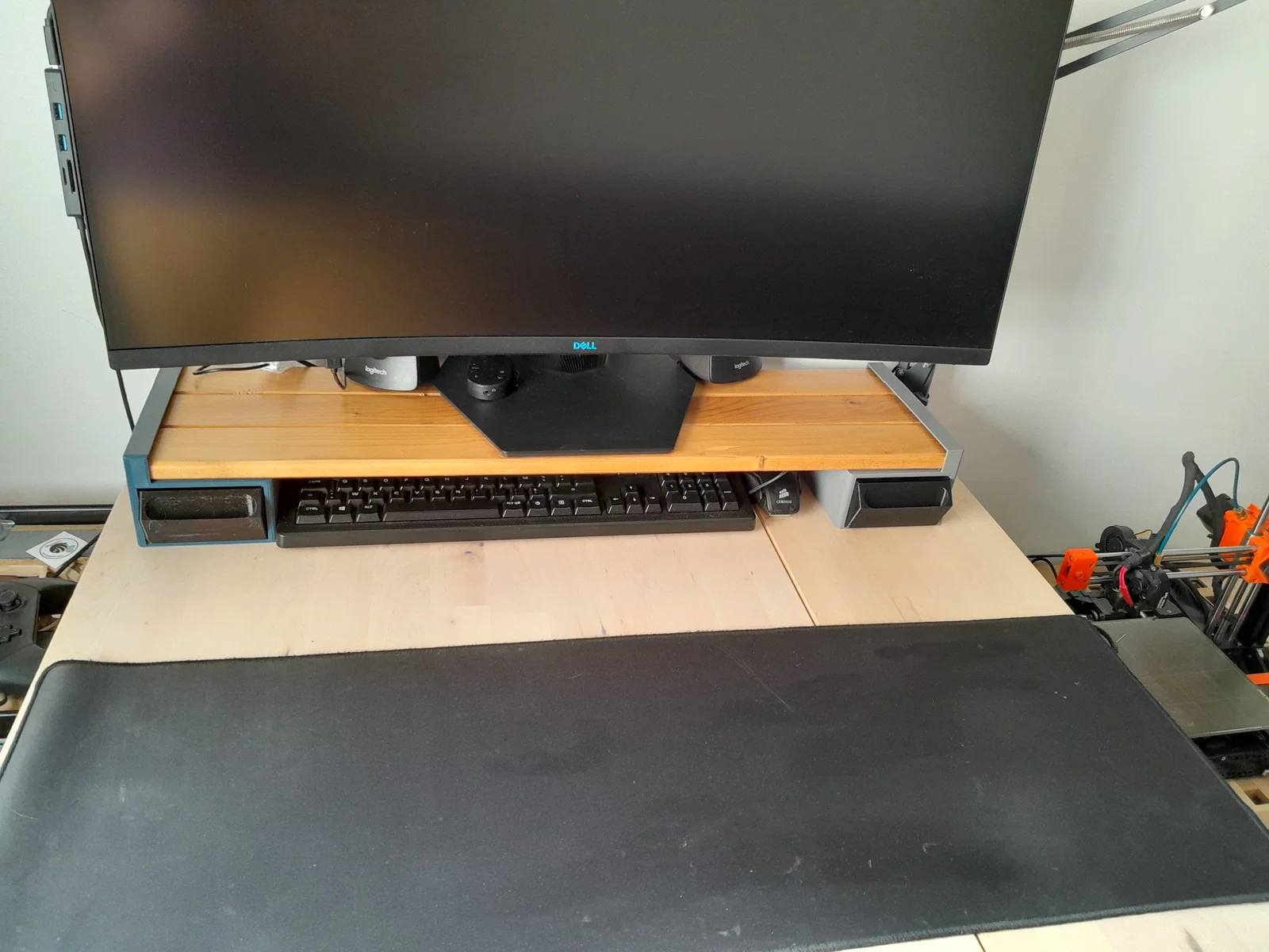 Kệ kê màn hình để bàn có 2 ngăn kéo, thiết kế để chừa khoảng trống 70 mm bên dưới cho bàn phím/chuột. Phần gỗ dùng ván tùy ý, chi tiết in PLA+/PETG (khuyên PETG cho ngăn kéo), không cần support.