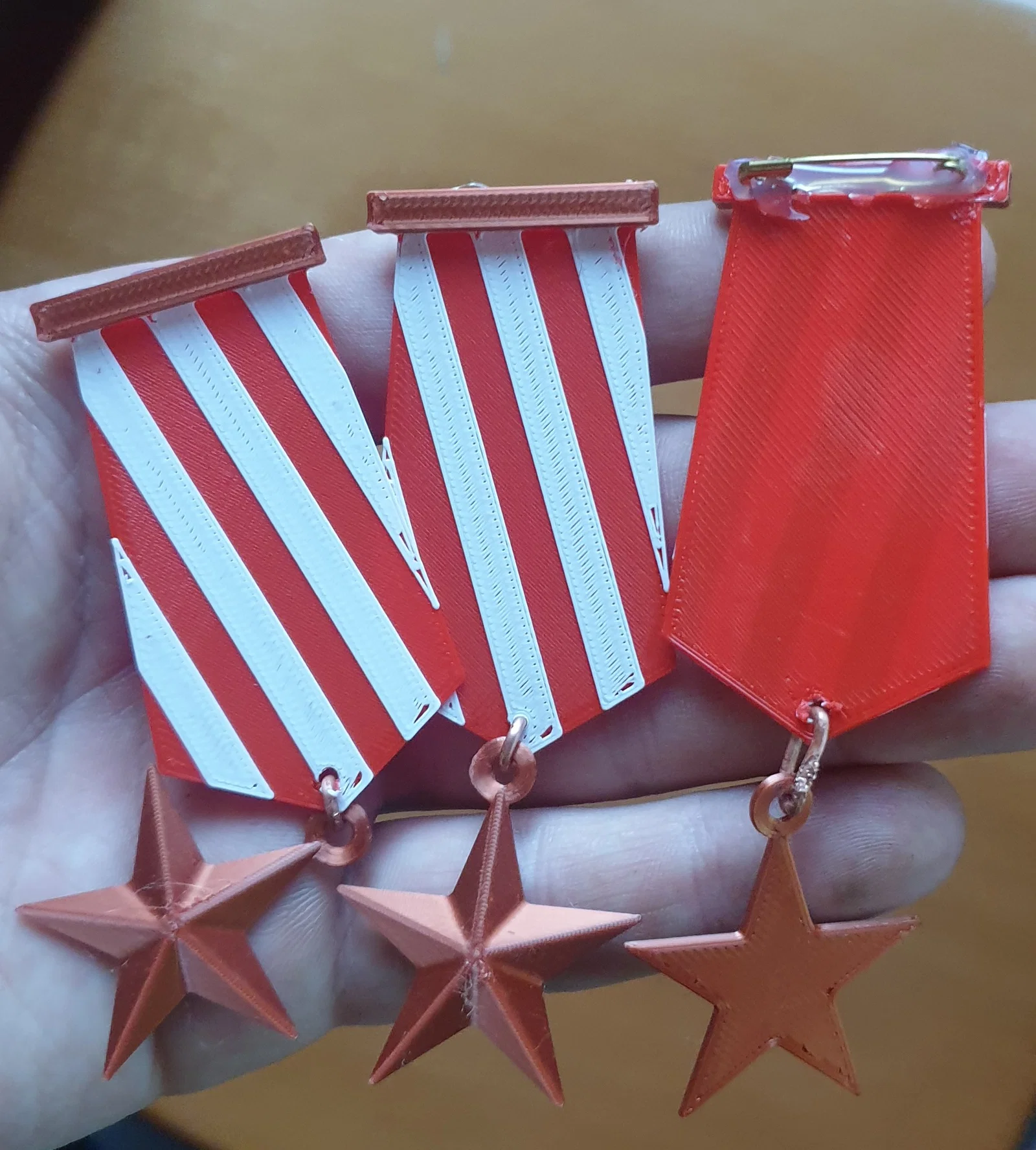 Huy chương ngôi sao năm cánh (pentagram) được in layer height 0,2mm và 2 lần đổi màu: bắt đầu bằng filament silver in 4 layer (0,8mm), sau đó in 2 layer bằng filament đỏ rồi đổi lại về silver như ban đầu. Lại là một mẫu rất hợp để ironing.