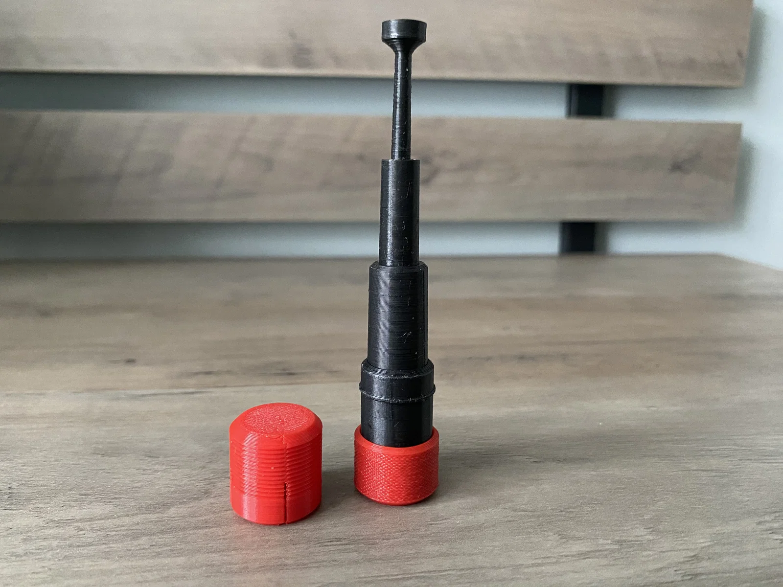 Lắp ráp xong cao 40 mm và rộng 20 mm. Kéo hết cỡ thì tầm với hơn 100 mm. Model được thiết kế để in 3 phần: một cốc đáy vặn ren (knurled screw-on bottom cup), phần ruột gồm các đoạn telescoping, và nắp có gân (ribbed cap) dạng snap fit. Nhớ vặn đáy thật chặt nha! Nhỏ một chấm keo 502 (super glue) vào trong cốc trước khi đặt nam châm vào.