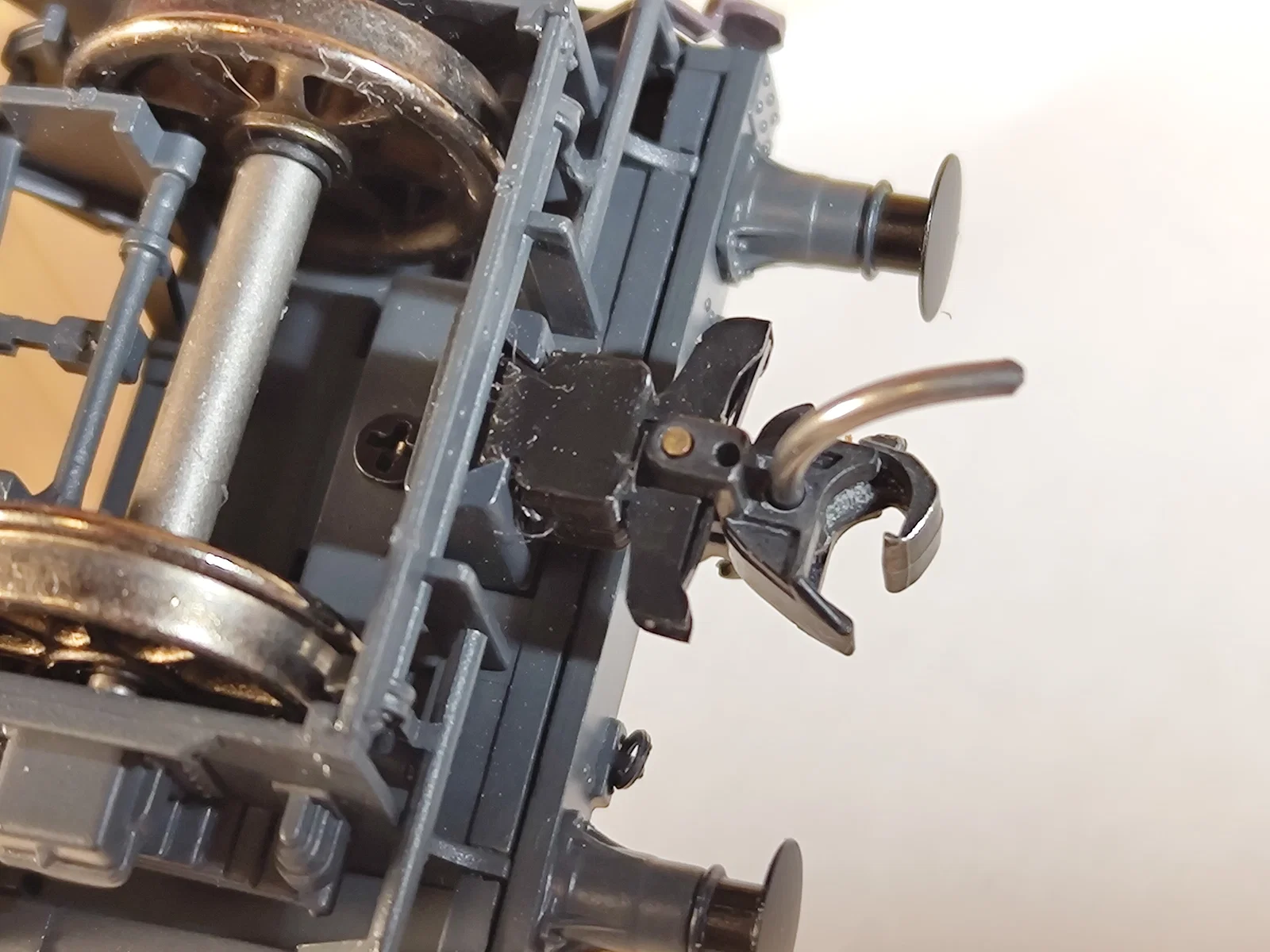 * Lưu ý: Nếu bạn gắn Kadees, kinh nghiệm mình hay làm là canh sao cho mặt trong của knuckle gần như thẳng hàng với mặt buffers heads. Thường như vậy thì toa có thể lùi qua đường cong bán kính số 2 (438mm) mà không bị buffer-locking. Tuy nhiên bạn có thể phải thử-sai vài lần!