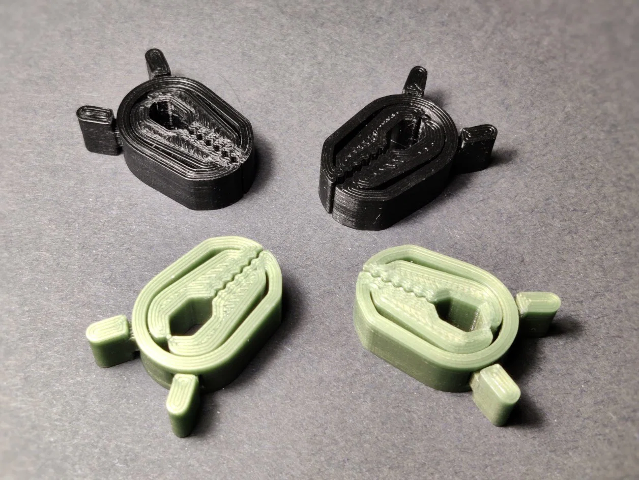 Vật liệu khuyến nghị là PETG vì giữ được độ “đàn hồi” tốt. ABS hoặc ASA cũng có thể ổn. PLA vẫn dùng được nhưng có xu hướng bị “creep” khi chịu lực kéo, và theo thời gian dễ giòn rồi gãy.