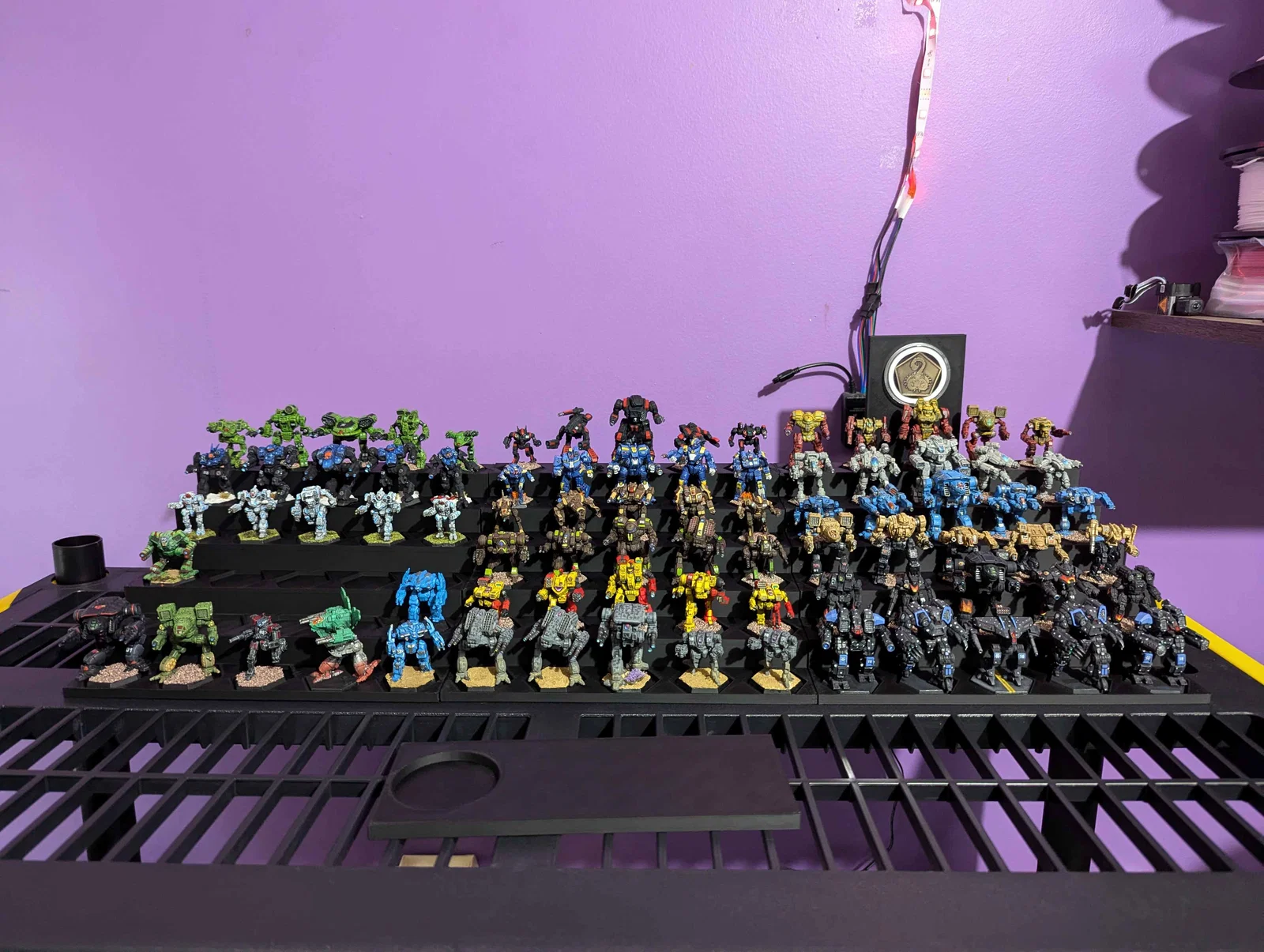 Kệ trưng bày cho miniatures Battletech giúp ‘mech không còn phải cất trong hộp. Có 2 bản: 4 ‘mech (lance) và 5 ‘mech (star), kèm tuỳ chọn challenge coin holder gắn phía sau. In không cần supports.