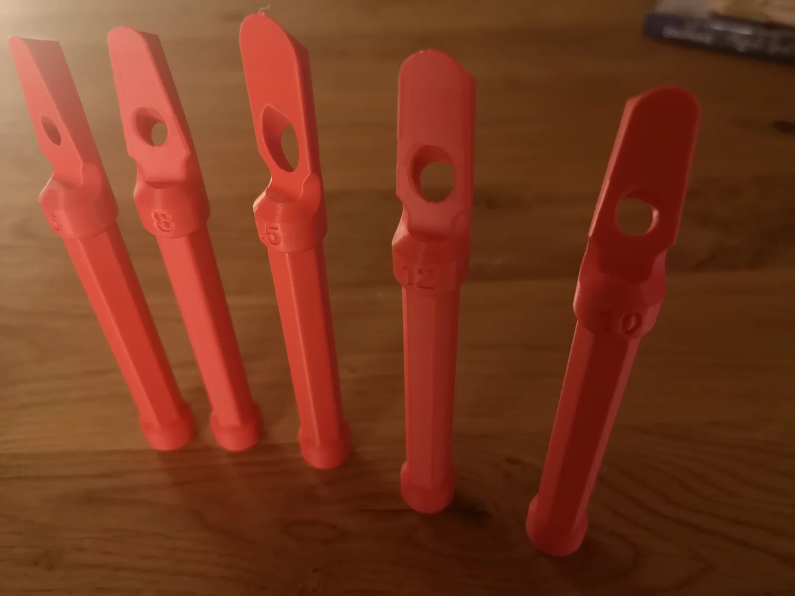 tôi hay gặp khó khăn khi làm các đường ron silicone cho đẹp nên bắt đầu tìm mấy dụng cụ tiện dụng. Tôi có thấy vài bộ dụng cụ bằng gỗ khá ổn, nhưng giá thì mắc (4€ cho mỗi cỡ). May là mình có 3D printer, nên tôi tự thiết kế vài cái rồi in ra test. Dùng đúng như mong đợi. Sau cùng tôi nhận ra kích thước đầu cắt của tuýp silicone rất quan trọng, nên tôi thêm luôn phần gợi ý cắt đầu tuýp góc 45° trực tiếp lên dụng cụ. Như có nhắc trong phần bình luận, mấy lỗ này hơi nhỏ, nên tôi đã bổ sung thêm một dụng cụ để cắt đầu tuýp silicone.
