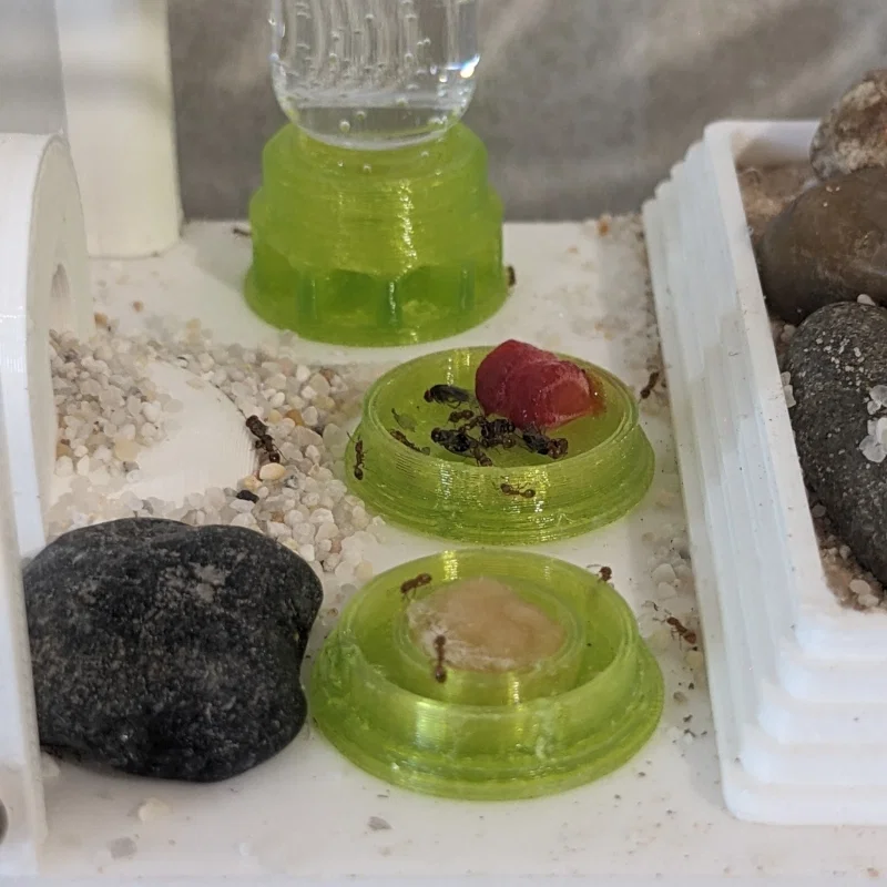 Bộ khay/dĩa cho kiến ăn, gồm một dĩa dùng cho chất lỏng ngọt (đặt bông gòn ở giữa rồi nhỏ dung dịch lên). Có tham chiếu mẫu khay nước từ Thingiverse. In được PLA, khuyên PETG để kín nước hơn.