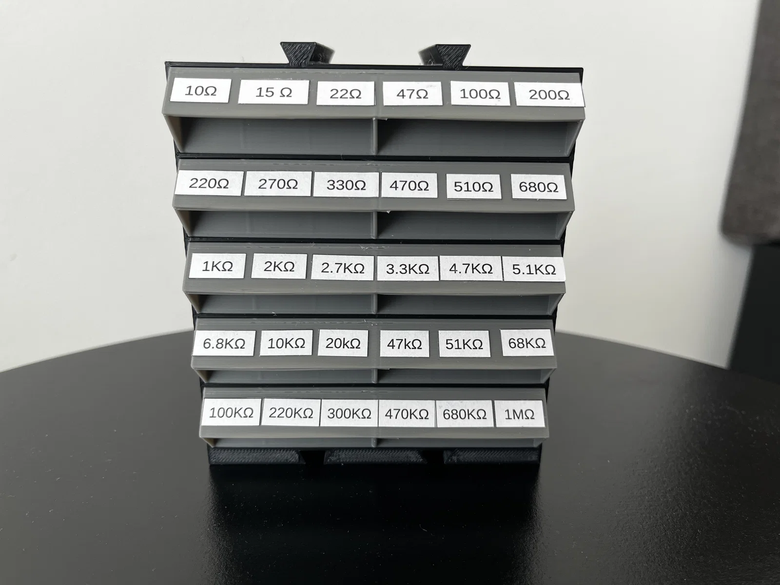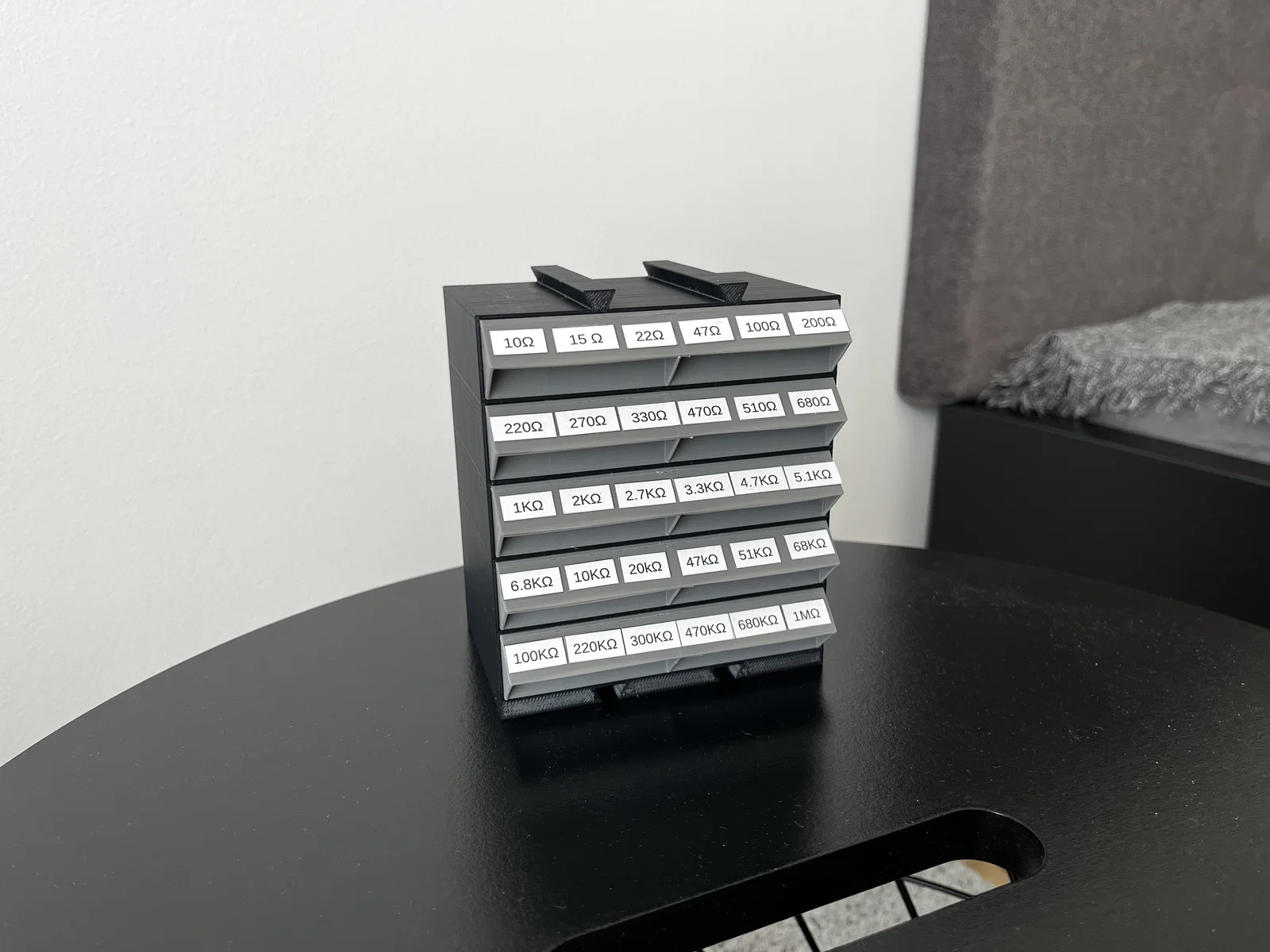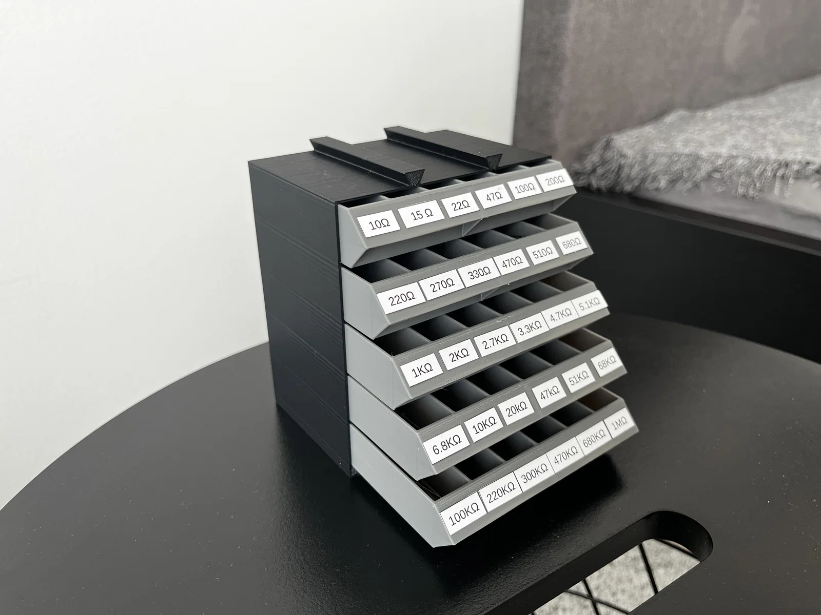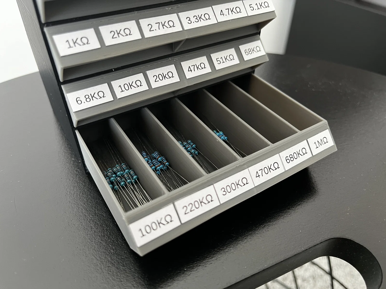 Hộp lưu trữ điện trở dạng parametric đơn giản: bạn tự chọn số ngăn kéo, số khoang chia và kích thước theo nhu cầu. File chỉnh sửa qua Onshape; in 3D không cần supports.