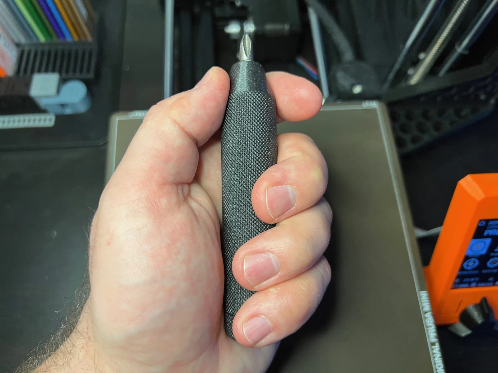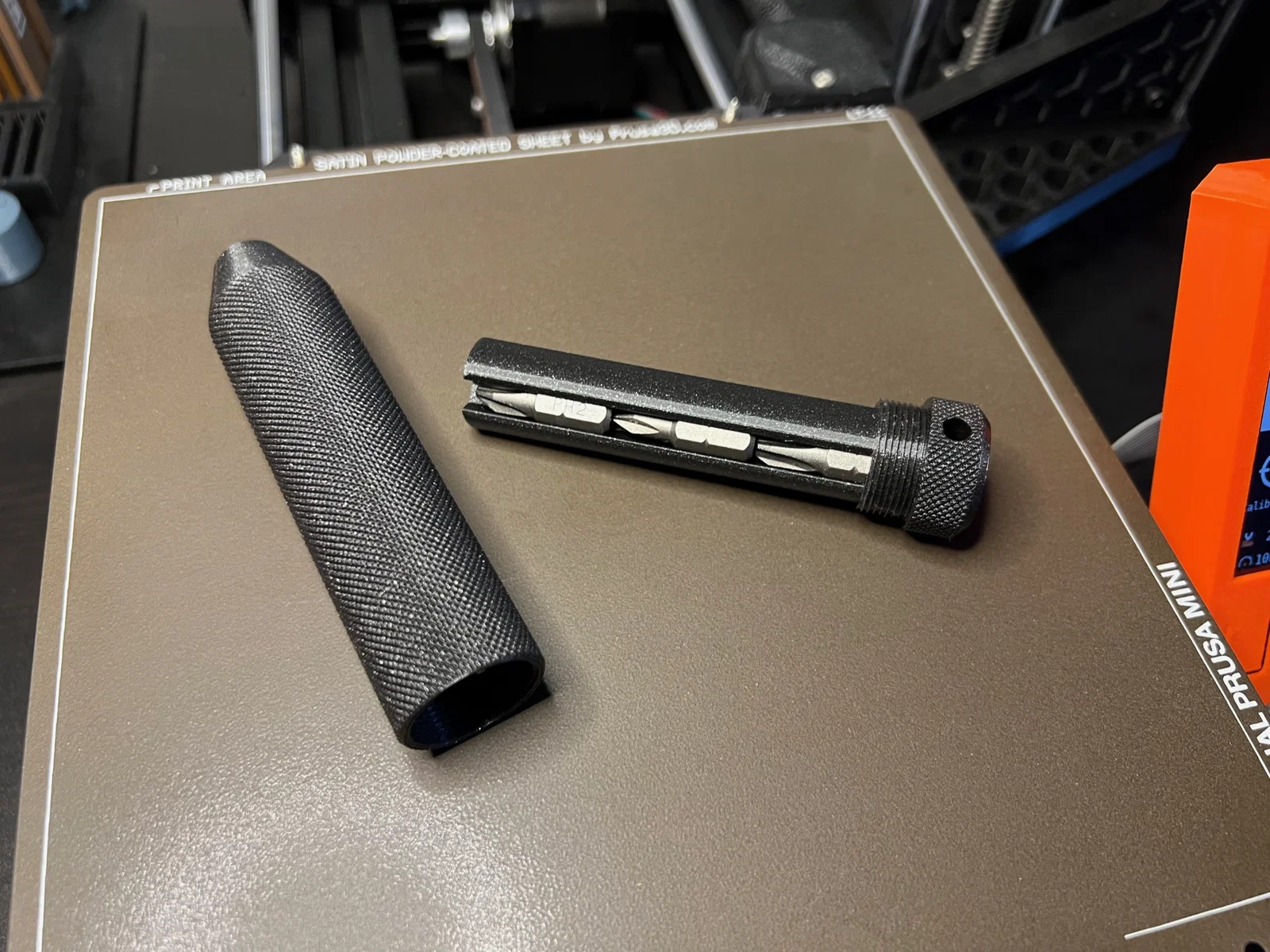 Mẫu tua vít nhỏ gọn có ngăn chứa bits tích hợp, phù hợp EDC và dùng khi cần tua vít ngắn. Thiết kế parametric dễ tùy biến số lượng bits (3/6/9/12…), có STL sẵn, hỗ trợ gắn magnet để giữ bits chắc hơn.