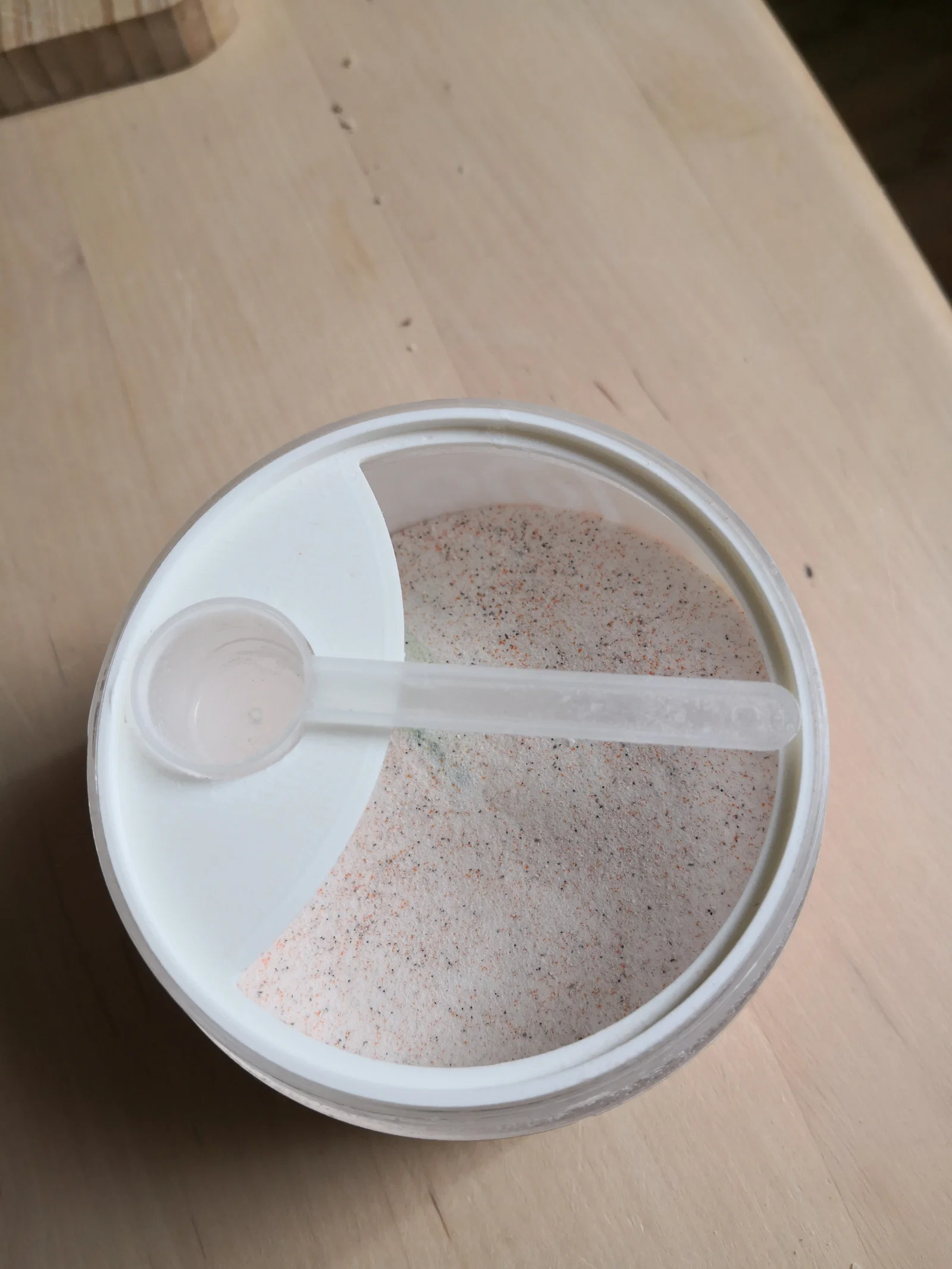 Giá đỡ muỗng (spoon holder) dành cho hũ Chunky Flavour 150g, giúp lấy muỗng không bị dính bột vào tay. In nhanh, dễ; nếu chưa đủ ma sát để bám chặt khi ấn vào, có thể scale lớn lên chút.