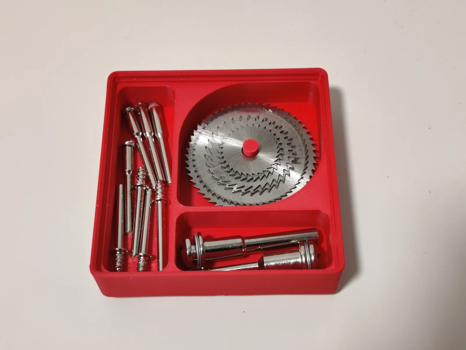 Khay đựng theo chuẩn gridfinity có thể xếp chồng, dành cho lưỡi cưa đĩa Dremel / Proxxon kích thước 2x2x3, có các ngăn chia. Đường kính lưỡi cưa tối đa có thể lên tới 50 mm. Đường kính trụ gắn lưỡi cưa là 6 mm.