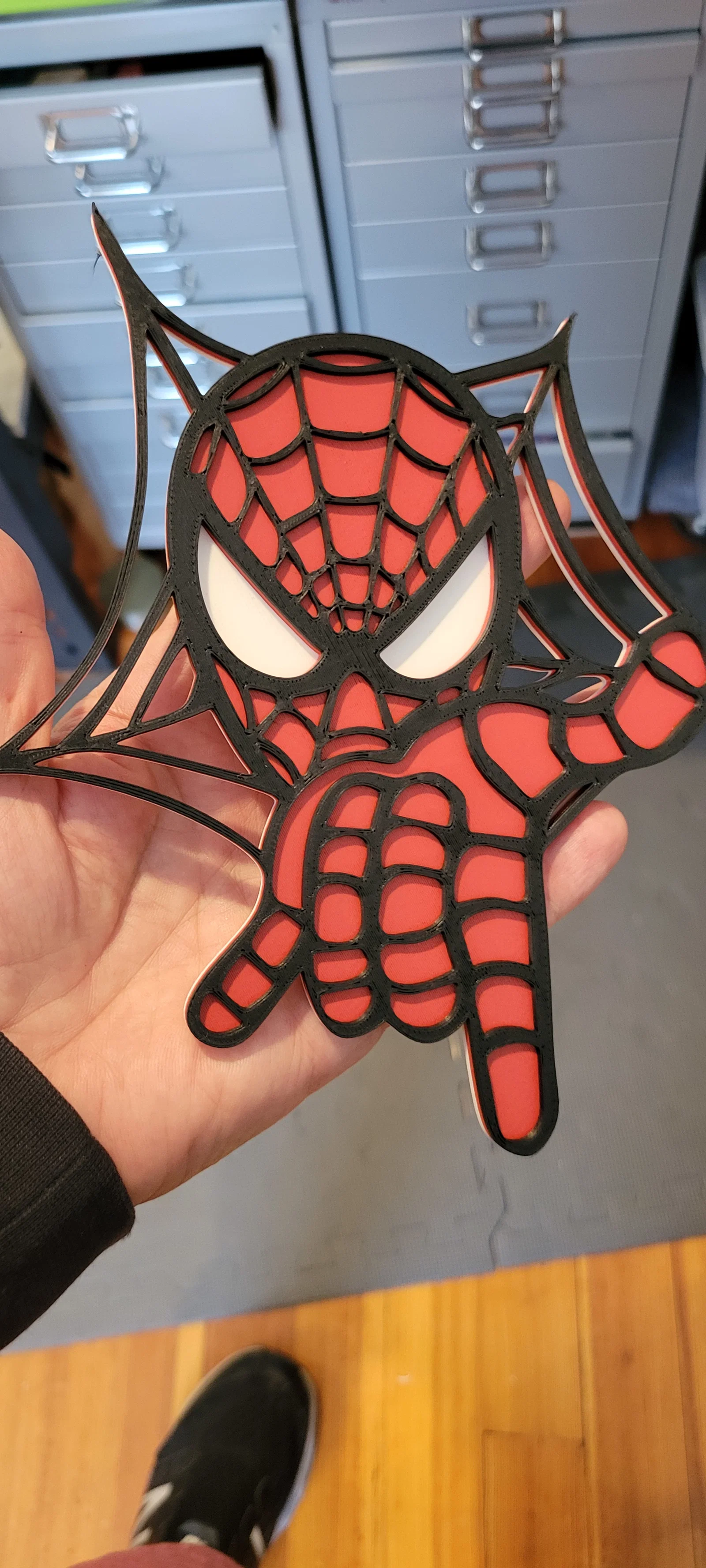 Mẫu bảng tên Spiderman cho phòng bé, chỉnh lại từ wall art của Ts3D để in 3 màu bằng cách đổi filament theo layer. Có bản trống để tự thêm tên. File đã rescale: rộng 170mm, dày 6mm.
