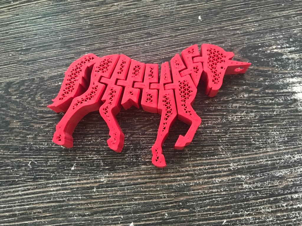Mẫu móc khóa kỳ lân dẻo. Để thành phẩm giống hình, trong slicer vào Horizontal shell và đặt Solid layer về 0 cho cả hai. Không cần supports hay rafts; infill và filament không quan trọng.