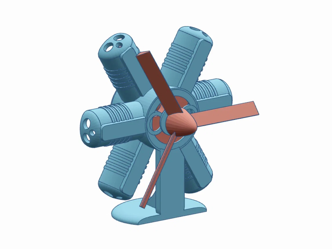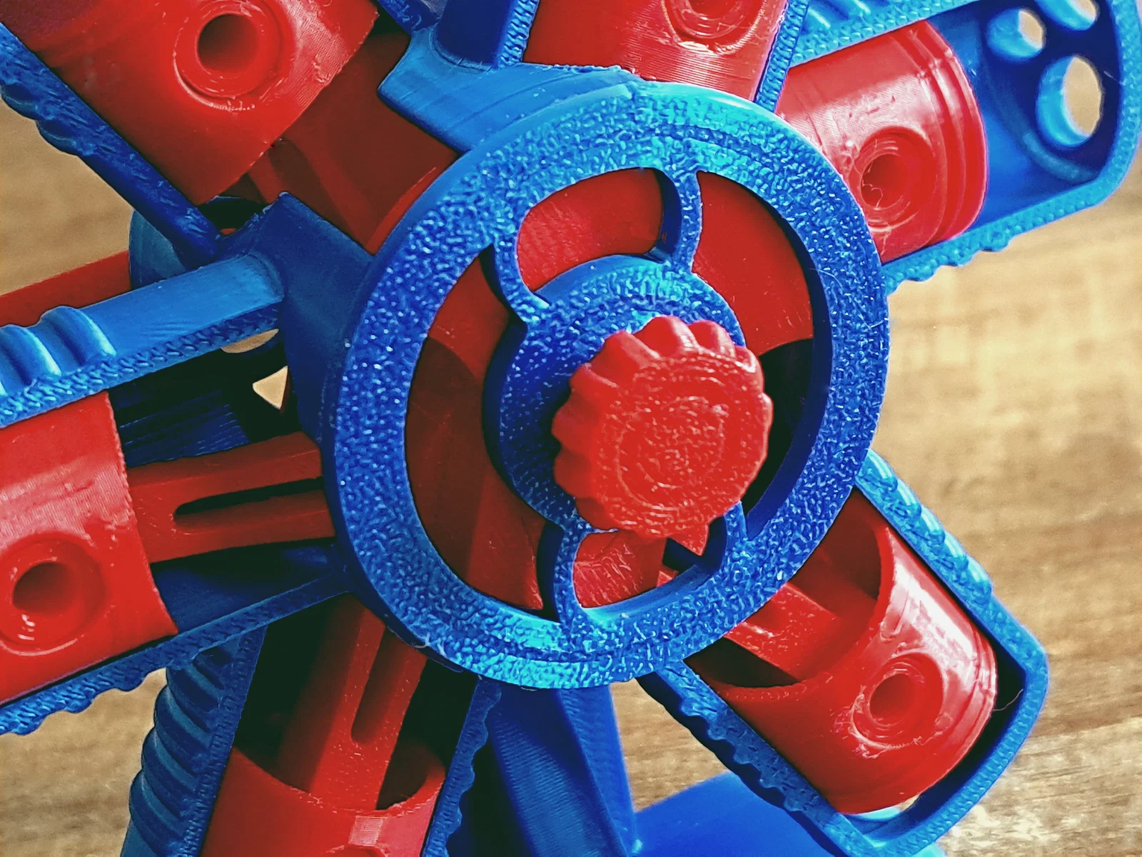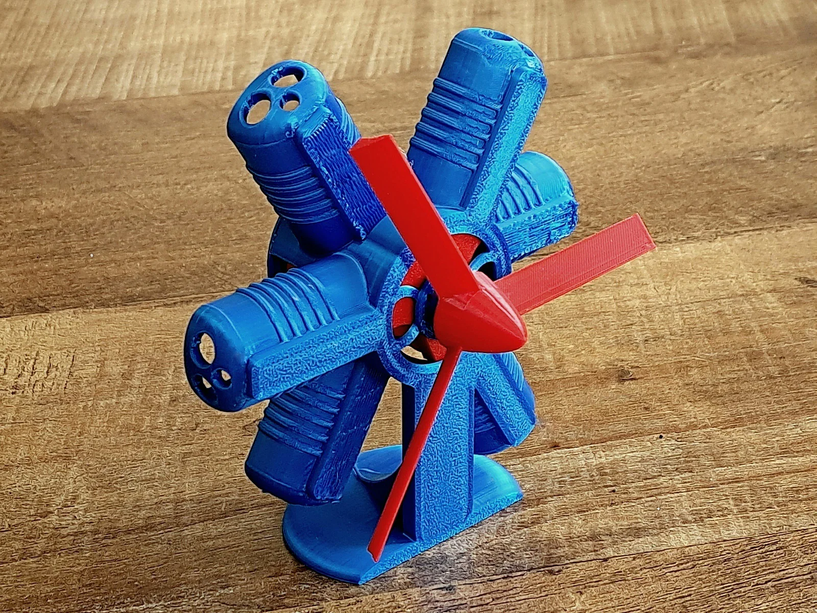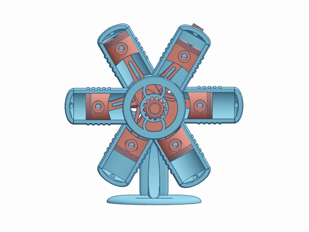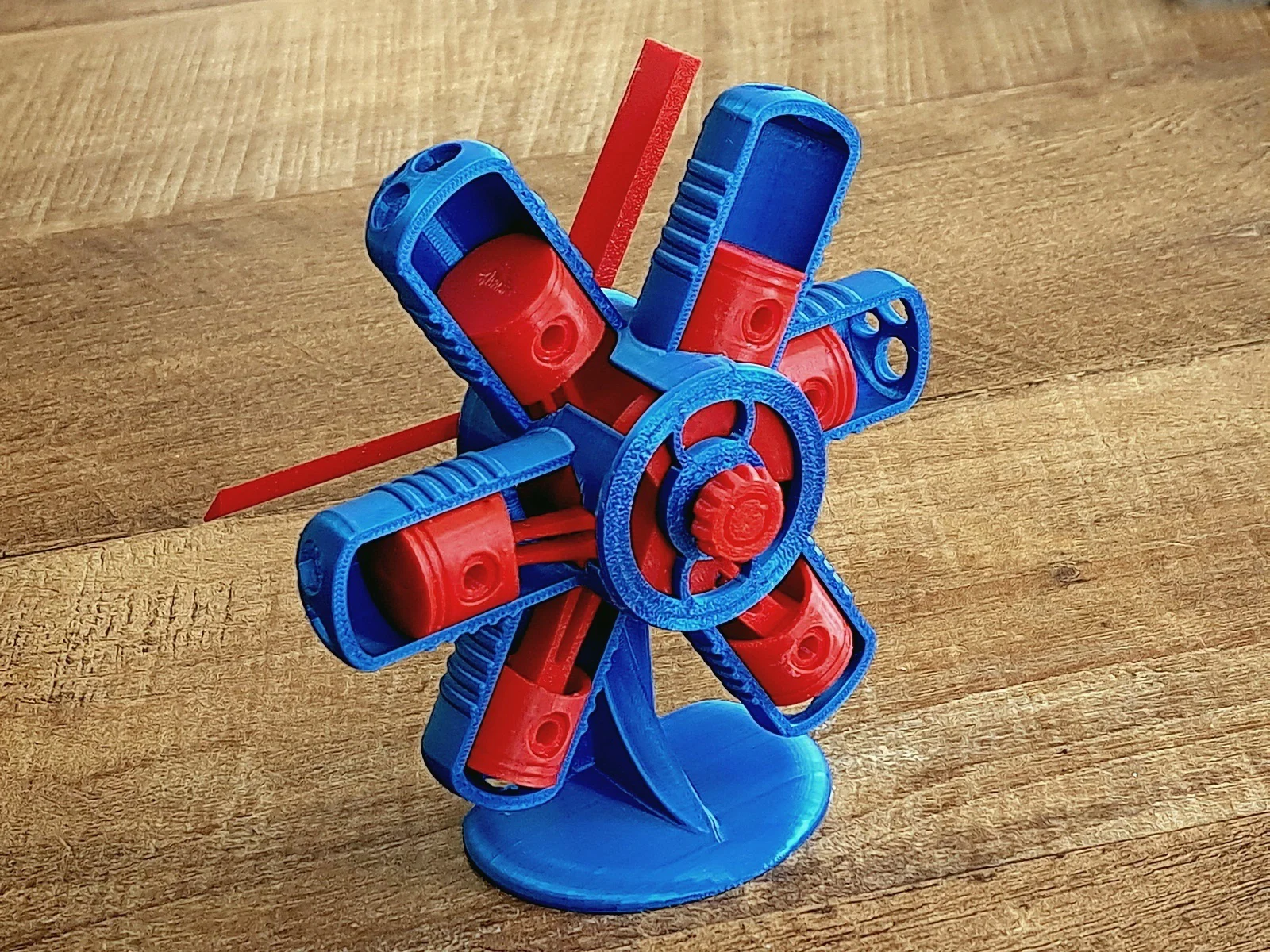 Mẫu Double Row Radial Engine dạng radial 2 hàng 6 xy-lanh. In crankcase và piston rods với support trên build plate, PLA+ layer 0.16 mm. Kích thước 127×78×127 mm, nặng khoảng 0.1 kg, kèm hướng dẫn lắp ráp chi tiết.