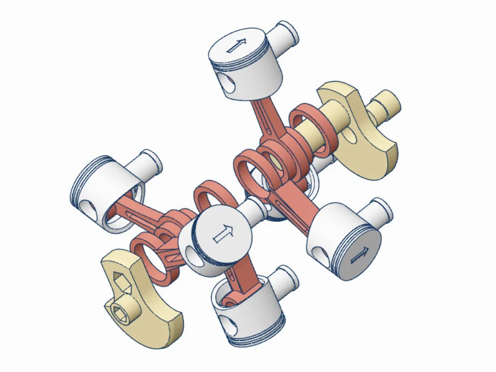 Phần crankcase và các piston rods được in kèm support đặt trên build plate.