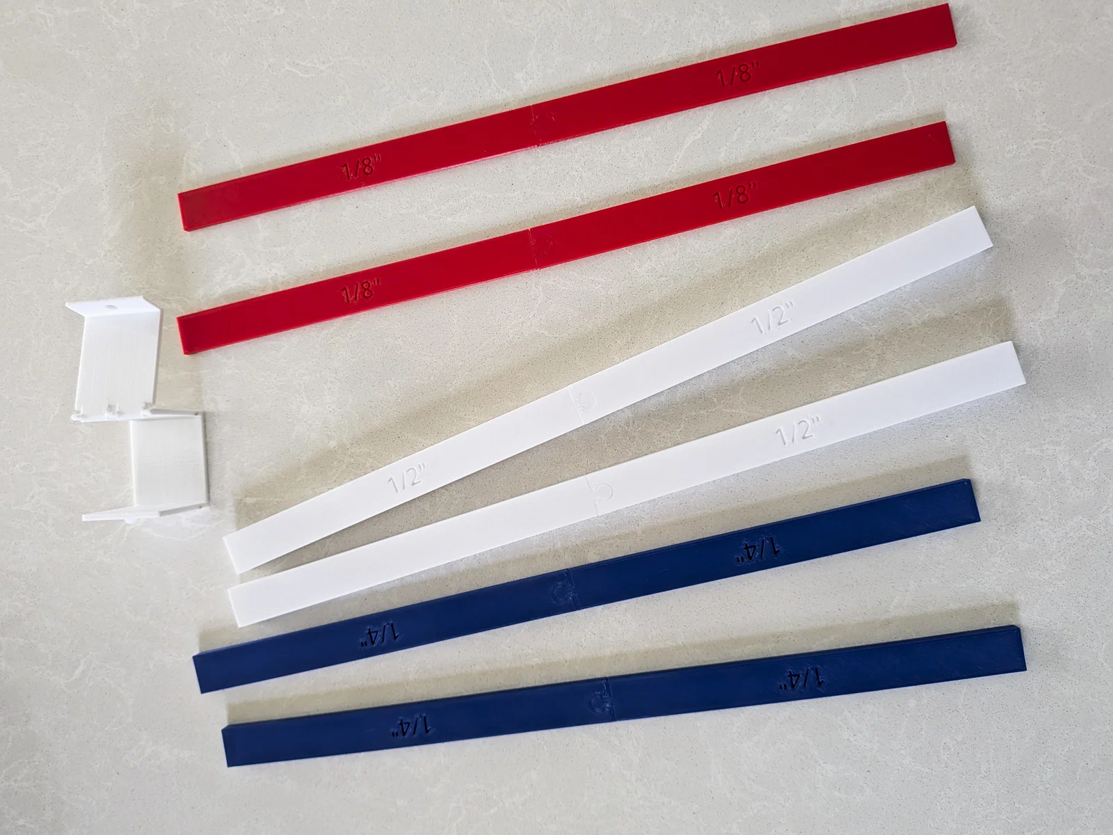 Bộ guide canh độ dày để cán bột pastry đều tay, gồm 3 cỡ 1/8", 1/4", 1/2" và hộp đựng. Có thể chồng các guide để tạo thêm độ dày khác, ví dụ 3/8".