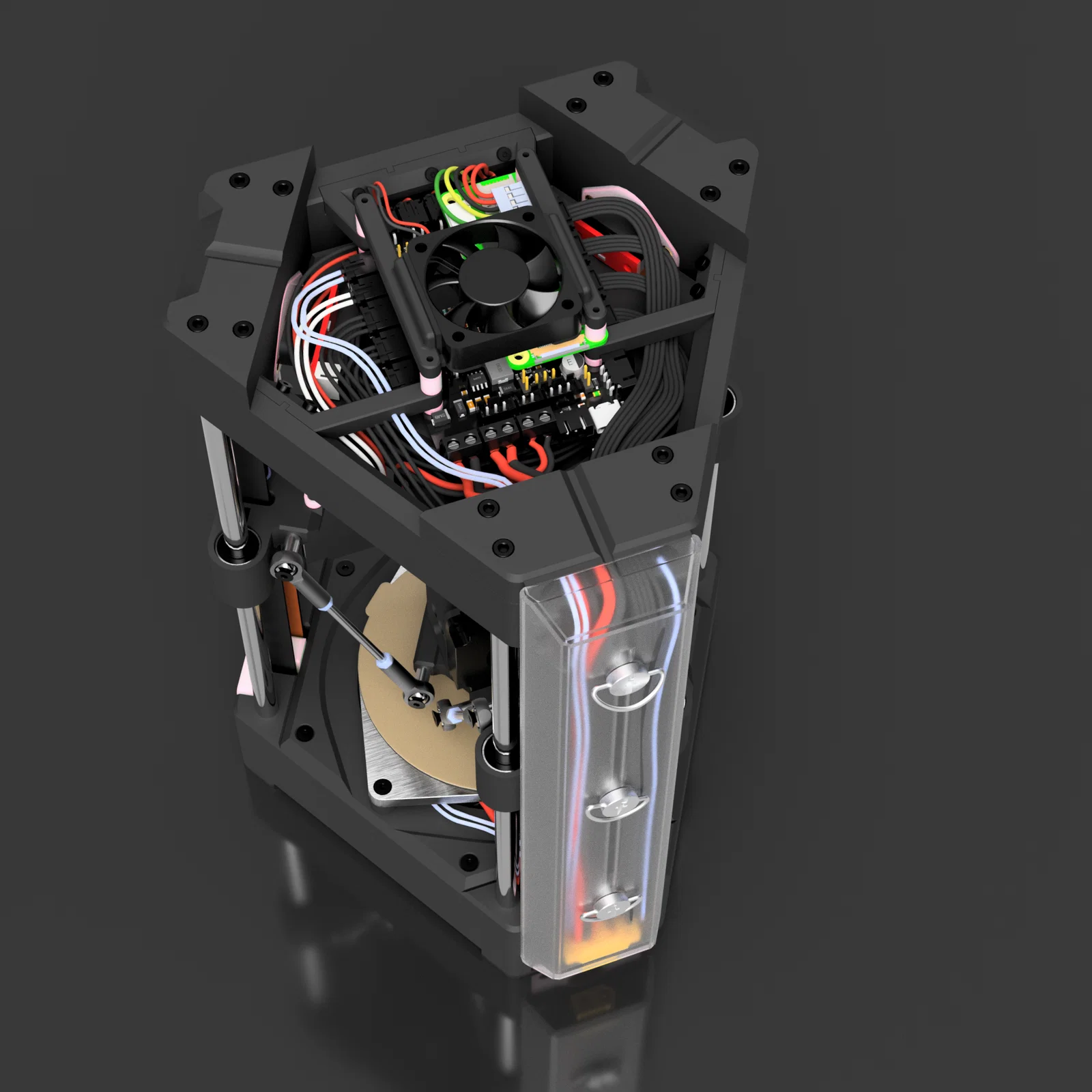 MIN_SB01_80 là phiên bản mình tinh chỉnh từ micro delta MIN của Rolohaun, hướng tới máy mini gọn hơn: Revo micro + 2 quạt 3010, belt 9/10mm, build volume 80×75mm, bed nhiệt 100mm và mainboard mount dạng modular.