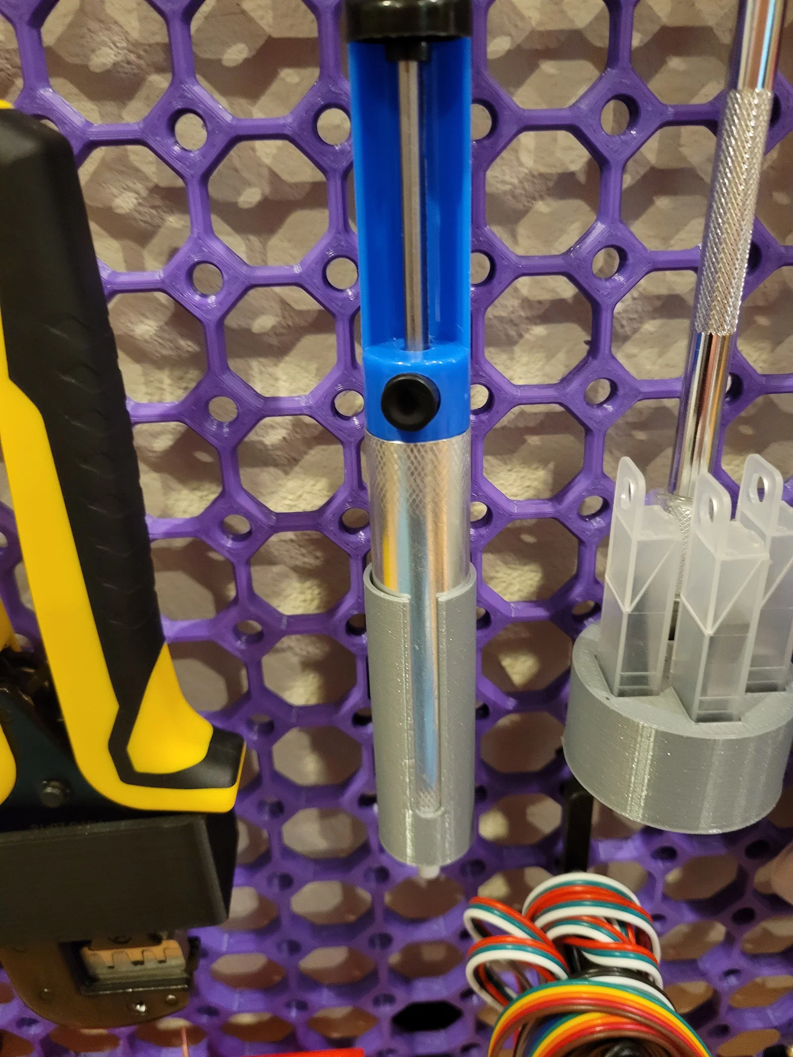 Mẫu giá đỡ/giá treo Desoldering Pump gắn Multiboard, giúp cất gọn dụng cụ hút thiếc trong góc làm điện tử. Thiết kế đơn giản, dễ in, phù hợp setup bàn hàn và khu vực sửa chữa.