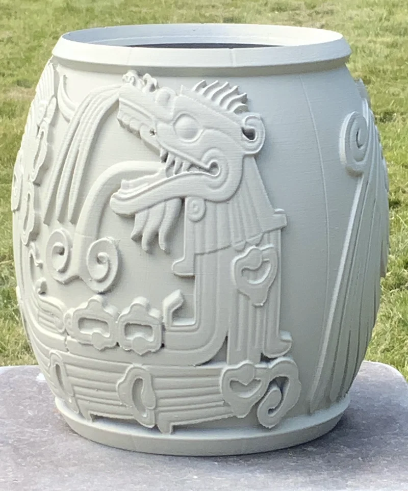 Một cái chậu trồng cây/bình (urn) có hoạ tiết rắn Aztec, được copy từ “Quetzalcoatl feathered serpent pyramid”.
