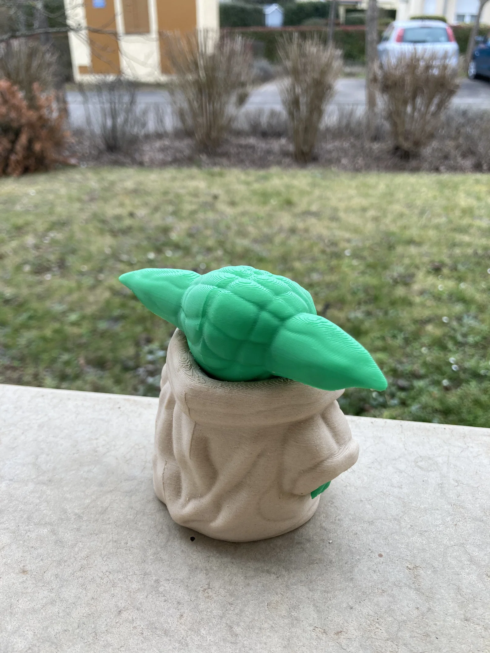 Mẫu Baby Yoda dành cho Bambu Lab X1-Carbon có AMS. File STL được tô màu trên Bambu Studio rồi in ra với Support bật, thời gian in khoảng 4h48. Có gợi ý filament wood/xanh/đen và timelapse.