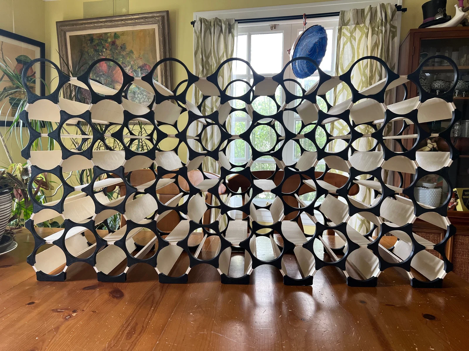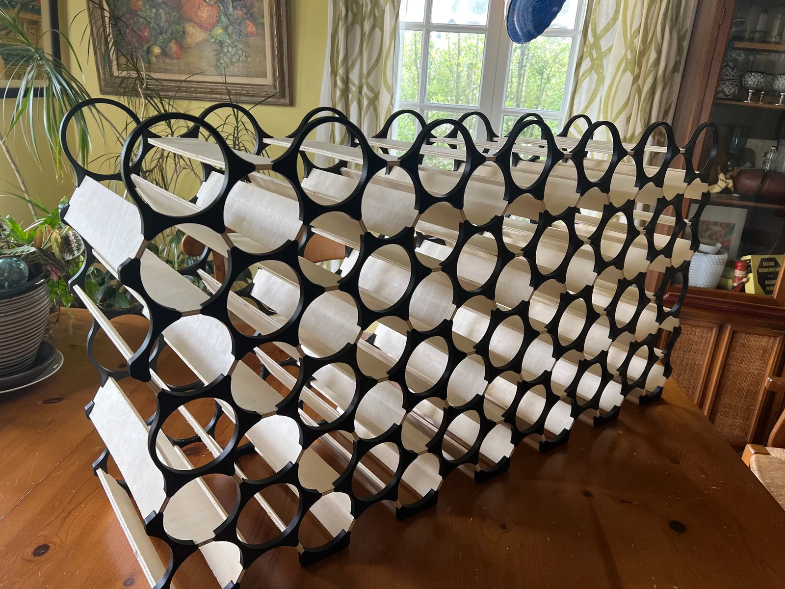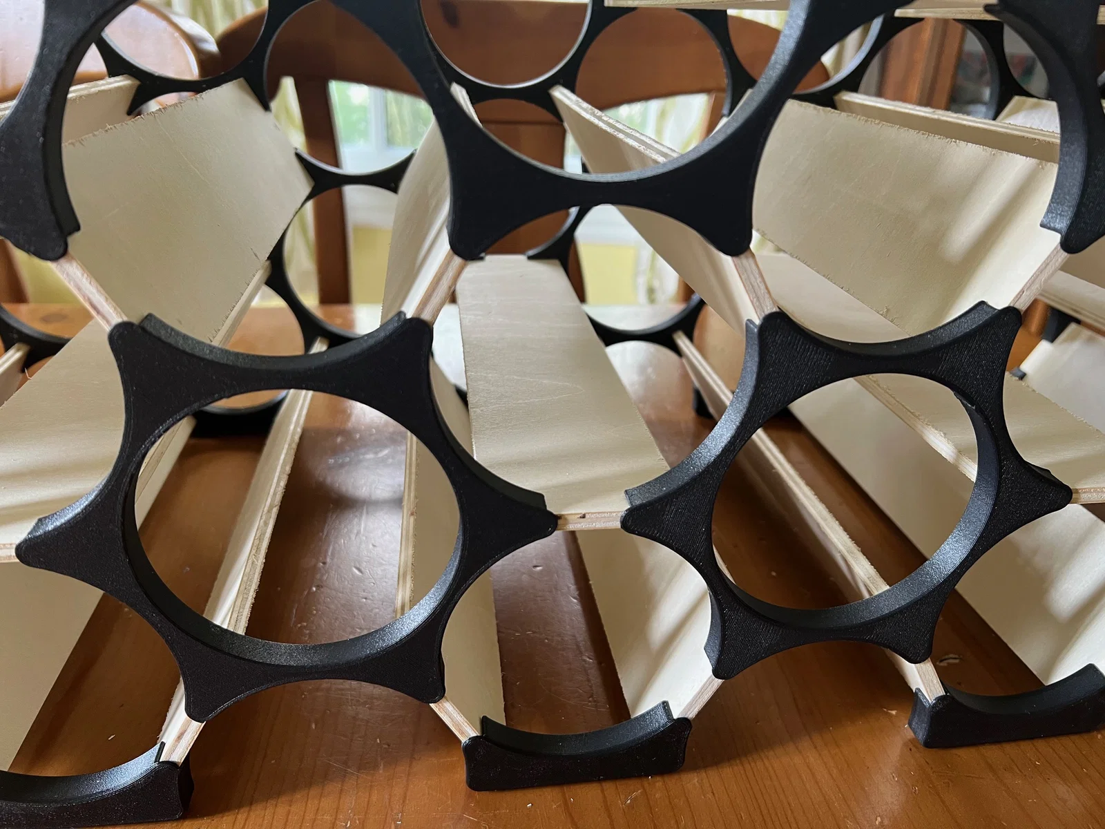 Khi lắp xong, nhìn nó vừa đẹp vừa “đánh lừa” thị giác vì nhiều vị trí để đặt chai lại không có chi tiết nhựa riêng; chúng nằm ở phần giao nhau/biên của ba chi tiết nhựa khác. Các chi tiết nhựa không đỡ chai. Chi tiết nhựa chỉ định vị vị trí của các thanh plywood, và chính các thanh plywood mới là phần đỡ chai. Rất bất ngờ là vật liệu dùng ít như vậy mà kệ hoàn thiện lại chắc đến thế. Không hiểu sao mình khá tự hào về nó và hy vọng bạn cũng thích. Khi lắp đúng, nó cực kỳ cứng cáp — nhờ hình học. Kệ của mình cao 6 tầng chai, và chắc bạn còn có thể đứng lên nếu phân bổ lực đều.