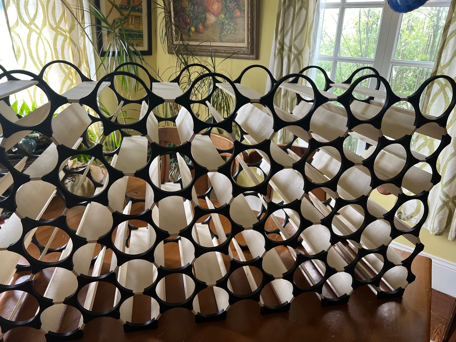 Mình khá thất vọng với mấy kệ rượu bán sẵn ngoài thị trường và cả các mẫu kệ rượu khác trên Printables. Mình không chắc đây có phải là kệ rượu “hiệu quả nhất” không — nhưng mình biết chắc là nó cực kỳ hiệu quả. Nó dựa trên cách xếp chồng lý tưởng của các vòng tròn đường kính 3.84" và giữ được chai có đường kính hơn 3.5" một chút. Ở giới hạn lý thuyết — nếu kệ lớn vô hạn — thì cho mỗi 3 chai rượu bạn chỉ cần 2 chi tiết nhựa và 3 thanh plywood. Mọi thứ trong thiết kế đều “làm hai việc một lúc”. Thực tế thì không thể đạt hiệu suất hoàn hảo 100% vì bạn cần các chi tiết ở mép để hoàn thiện viền kệ.