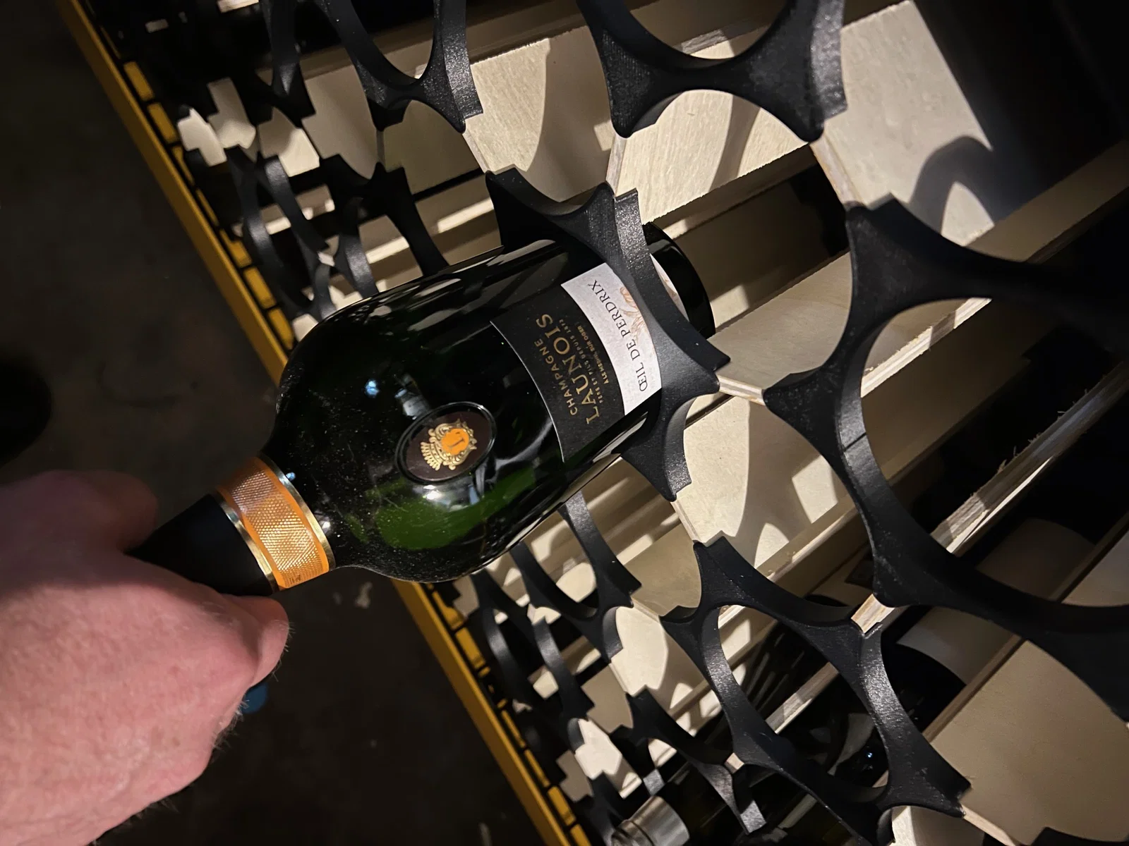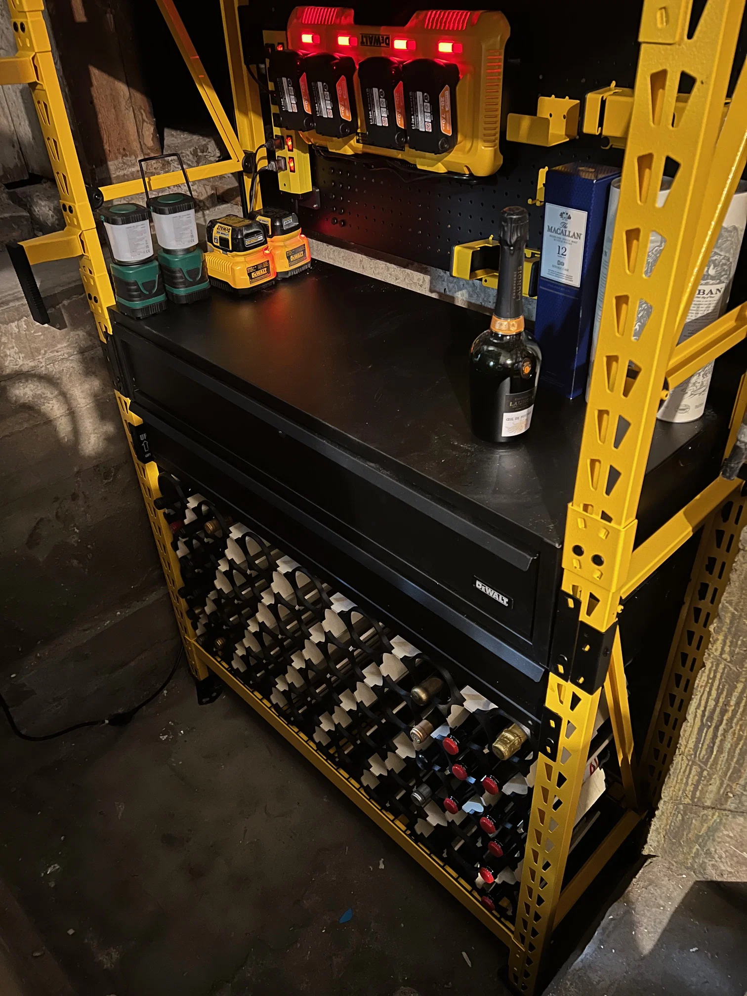 Bạn cần tự lên layout phù hợp không gian của mình. Mình có đính kèm hình của cái mình đã làm. Nó cao hơn 23.5 inch một chút và rộng dưới 45 inch. Nó chứa được 72 chai (tức 6 thùng), rất ấn tượng trong từng đó diện tích. Kệ chứa được chai đường kính tới hơn 3.5" một chút — nghĩa là hầu hết chai đều vừa, trừ mấy chai champagne “làm màu” to quá cỡ. Mình cũng đính kèm hình chai champagne “làm màu” không vừa để tham khảo.