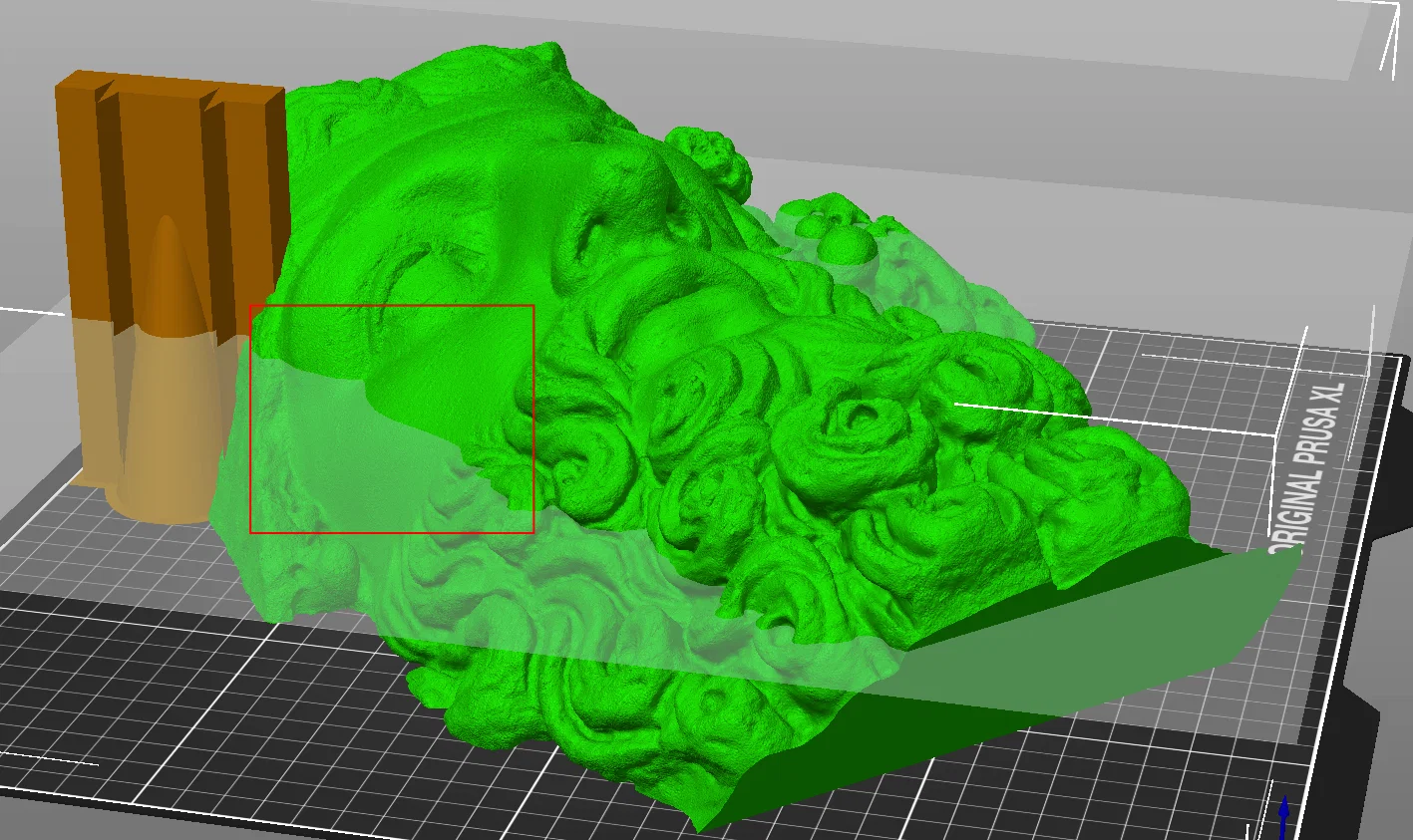 Bộ tượng gốc lấy từ dự án ‘Scan the World’, xem phần thông tin remix bên dưới để biết chi tiết. Các mặt cắt phẳng (plane cuts) và hướng đặt mẫu (model orientation) được thiết kế để giảm hao filament, để mỗi mẫu in ra dùng gần khoảng 1 cuộn filament và tầm 24 giờ in (hơn hoặc kém chút). Mình đang dùng OPXL5H. Dù in phần mặt tượng quay lên (face up) sẽ thấy đường layer, nhưng mấy lần mình thử in tượng dựng đứng (upright) thì tốn filament nhiều hơn, thời gian in kéo dài đáng kể và hay gặp lỗi support bị hỏng hơn. Tùy máy/tùy người (YMMV). Sau khi in Medusa xong, mình quyết định đổi workflow và mục tiêu để giảm dùng filament và làm mẫu nhỏ gọn hơn.
