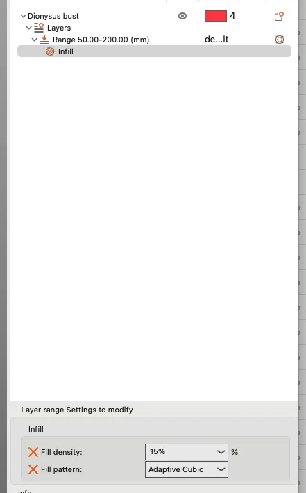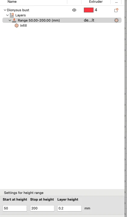 - Đổi layer settings ở đầu vùng da mặt (thường 50mm đến 100mm) để reset infill lên 15% và layer height xuống 0.20. Cách này giúp chất lượng phần mặt tốt hơn khi in face up.