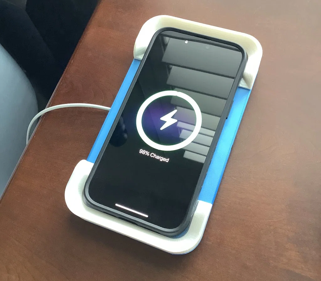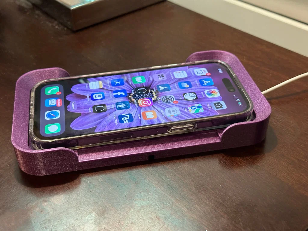 Đây là một khay sạc được thiết kế để dùng chung với MagSafe charger cho các dòng iPhone 13/14/15 bản thường/Pro/Plus/Pro Max. Mình thiết kế để cái “puck” MagSafe bám vào mặt lưng iPhone một cách cực kỳ đơn giản, và mình làm khay đủ lớn để dùng được với gần như mọi loại ốp (case friendly). Bạn chỉ cần đặt/“thả” điện thoại lên khay là được; các mép vát (beveled edges) sẽ giúp điện thoại tự trượt đúng vào vị trí.