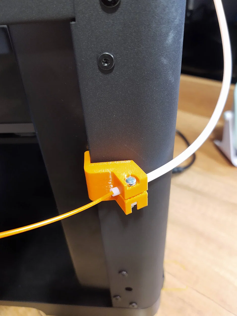 Kẹp hông cho Flashforge Adventurer 5M dùng kèm ống PTFE, giúp nạp filament dễ hơn khi bạn để cuộn ở bên hông máy. Không cần mod, chỉ bấm vào lỗ sẵn trên khung. Khuyến nghị in PET-G.