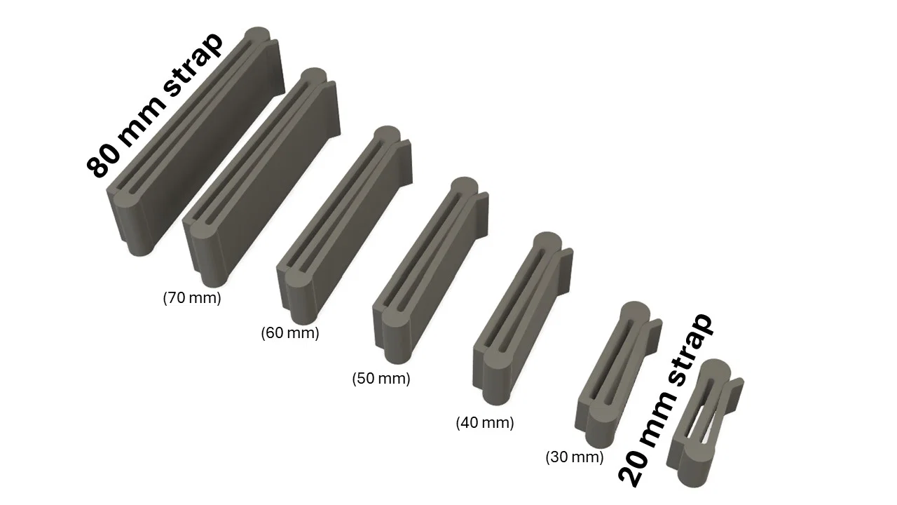 Đây là một strap keeper đơn giản, dùng như linh kiện thay thế để cố định phần hip belt trên balo. Nó giúp giữ gọn phần dây thừa/đuôi dây bị lỏng để không bị lòng thòng. Mình thiết kế nhiều phiên bản cho dây rộng từ 20 mm đến 80 mm, mỗi size đều chừa thêm 3 mm dung sai. Nếu cần canh chỉnh thêm thì bạn có thể chỉnh size trực tiếp trong slicer.