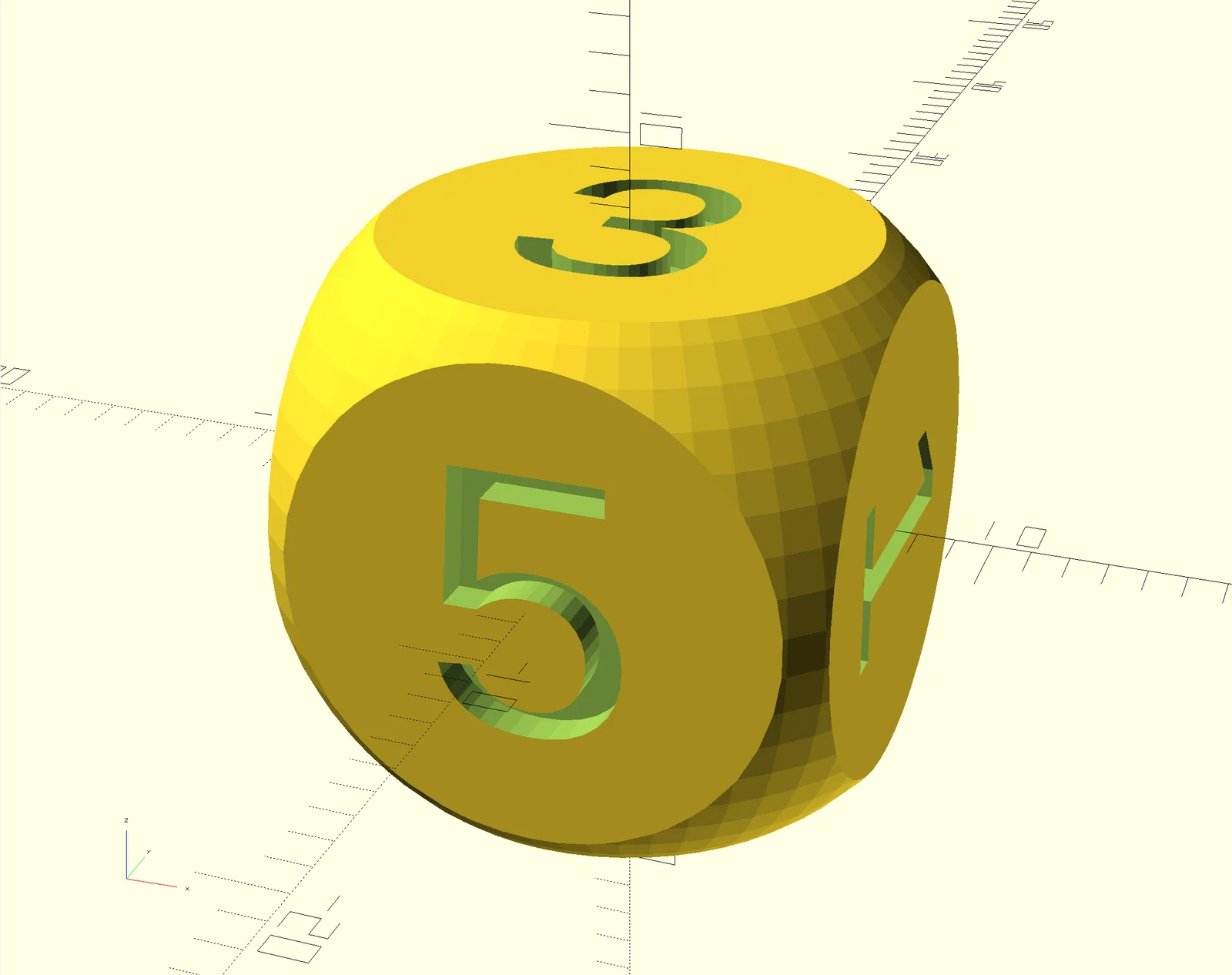 Bạn có thể in bản mẫu, hoặc chỉnh các tham số trong OpenSCAD rồi xuất file STL phù hợp cho xúc xắc bo tròn hoặc kiểu truyền thống cạnh vuông, đồng thời nhúng bất kỳ ký tự nào lên mặt xúc xắc.