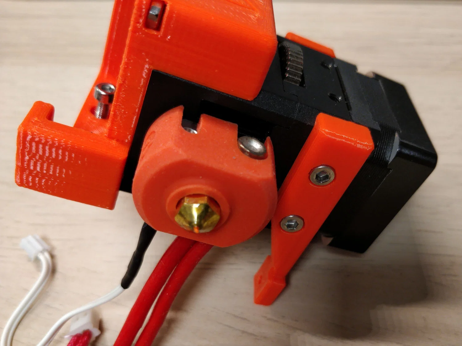 Do extruder nóng lên khá nhanh (hotend và stepper-motor truyền một lượng nhiệt đáng kể vào cụm lắp), quạt 24 V 35x35x10 mm đi kèm được thay bằng quạt 12 V 40x40x10 mm có lưu lượng gió cao hơn. Mount này được thiết kế theo đúng kích thước quạt đó. Với quạt này, cả cụm extruder giữ dưới 40 °C ngay cả khi in lâu với nhiệt độ in cao hơn.